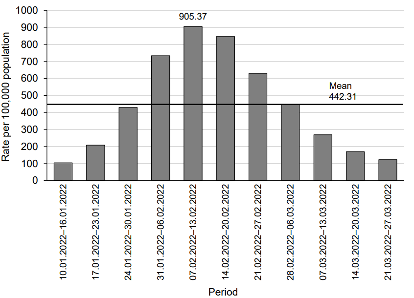 Fig. 7. Dynamics of COVID-19 incidence in the Russian Federation during the V period from January 10, 2022 to March 27, 2022.