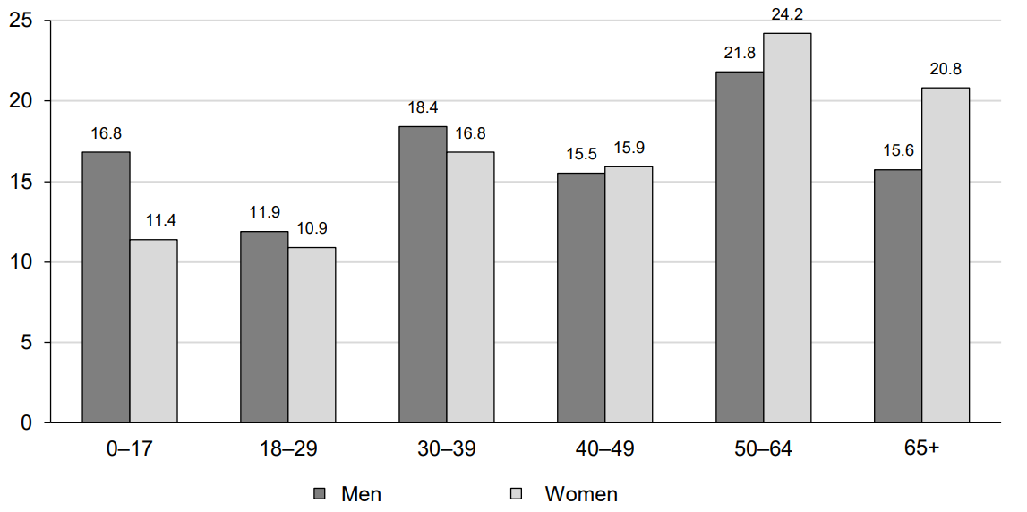 One of the priorities of the epidemiological surveillance over COVID-19 is identification of target groups of population at high risk of infection. The retrospective epidemiological analysis of the data collected at different points of the epidemic during 2020–2022 showed that the gender-age structure of COVID-19 cases was mostly represented by women and men aged 50–64 years (24.2 and 21.8%, respectively) and female and male patients over 65 years (20.8 and 15.7%, respectively). The lowest proportion among the COVID-19 cases was reported for individuals aged 18–29 years (with women accounting for 10.9% and men – for 11.9%), which can be explained by the prevalence of asymptomatic cases due to active functioning of the immune system providing effective protection of the host against infectious agents (Fig. 9). The above data are consistent with the results obtained by Russian researchers in 2020 and demonstrating that COVID-19 is the disease affecting primarily middle-aged and older adults [24].