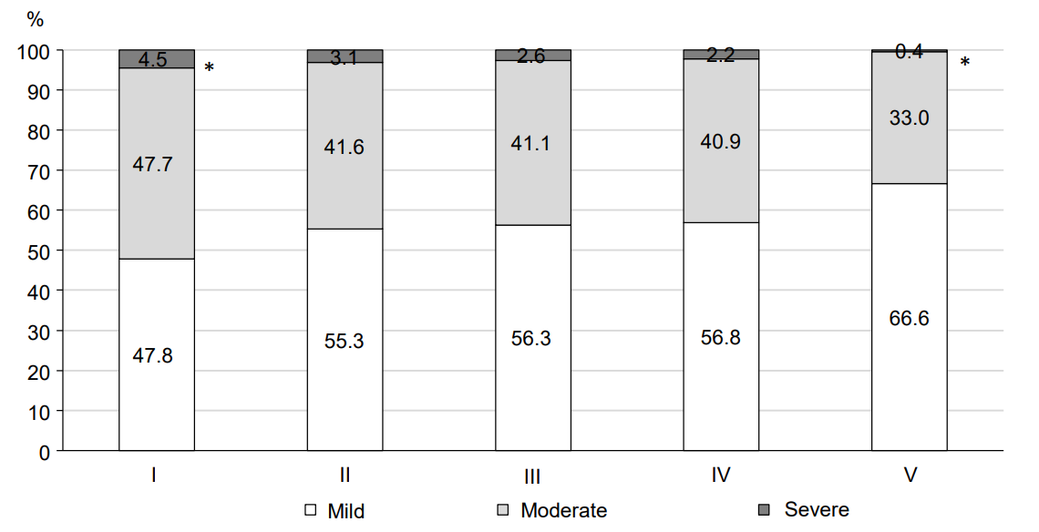 Fig. 11. The distribution of COVID-19 cases by the disease severity in the Russian Federation at the I–V stages of the epidemic. * р < 0,05.