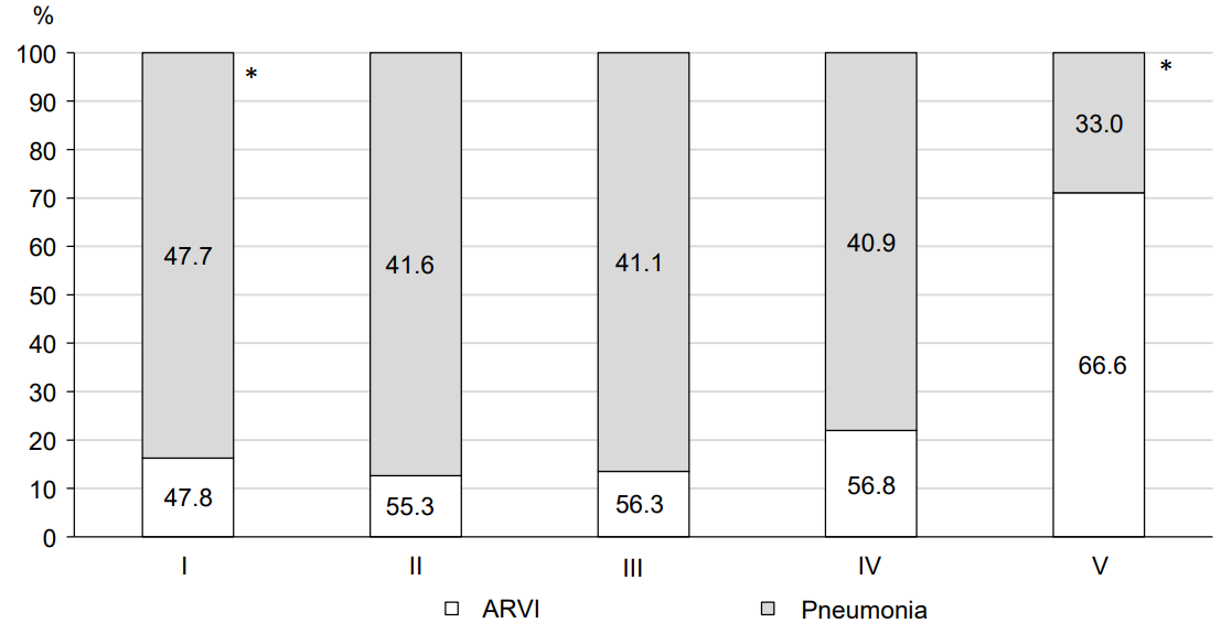 Fig. 12. Distribution of the clinical variants of registered cases of COVID-19 in the Russian Federation during the I–V stages of the epidemic. * р < 0,05.