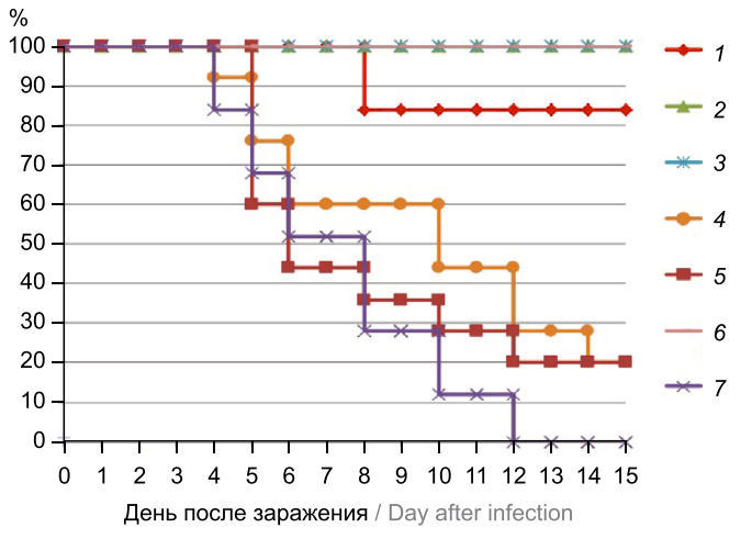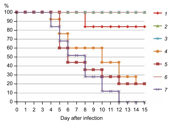 Fig. 1. Survival rates in animals vaccinated with the influenza CA-containing QV or with CA at different doses the challenge infection with the influenza A/California/04/09 (H1N1) virus. 1 — 0.1 of the vaccine dose; 2 — 1 vaccine dose; 3 — 5 vaccine doses; 4 — CA, 200 μg; 5 — CA, 1,000 μg; 6 — the monovalent H1N1 vaccine, 5 μg; 7 — control. In all cases, p < 0.0001 compared to the control group.