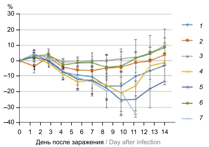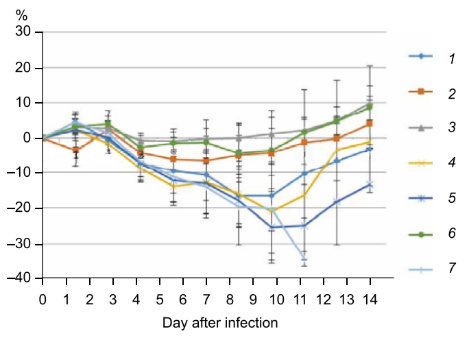 Fig. 2. Changes in the body weight of animals vaccinated with the CA-containing influenza QV and its components after the challenge infection with the influenza A/California/04/06 (H1N1) virus. 1 — 0.1 of the vaccine dose (p = 0.391); 2 — 1 vaccine dose (p = 0.00398); 3 — 5 vaccine doses (p = 0.00391); 4 — CA, 200 μg (p = 0.993); 5 — CA, 1000 μg (p = 0.503); 6 — monovalent vaccine H1N1, 5 μg (p = 0.00398); 7 — control.