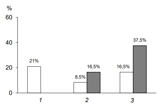 Рис. 1. Фенотипические группы и продукция МБЛ blaVIM у P. aeruginosa. 1 — чувствительные; 2 — МЛУ; 3 — ЭЛУ. Светлые столбики — изоляты, не продуцирующие VIM; темные — продуценты VIM. Fig. 1. Phenotypic groups and production of MBL blaVIM in P. aeruginosa. 1 — sensitive; 2 — multiple drug resistance; 3 — extreme drug resistance. Light bars — isolates that do not produce VIM; dark — VIM producers.