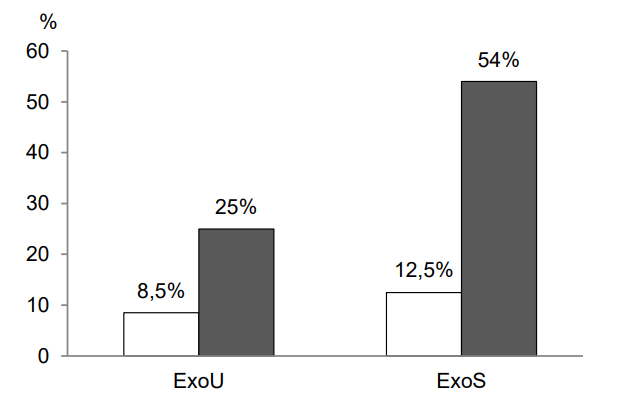 Рис. 2. ExoU- и ExoS-типы P. aeruginosa. Светлые столбики — чувствительные к карбапенемам; тёмные — резистентные. Fig. 2. ExoU- and ExoS-types of P. aeruginosa. Light bars — sensitive to carbapenems; dark bars — resistant to carbapenems.