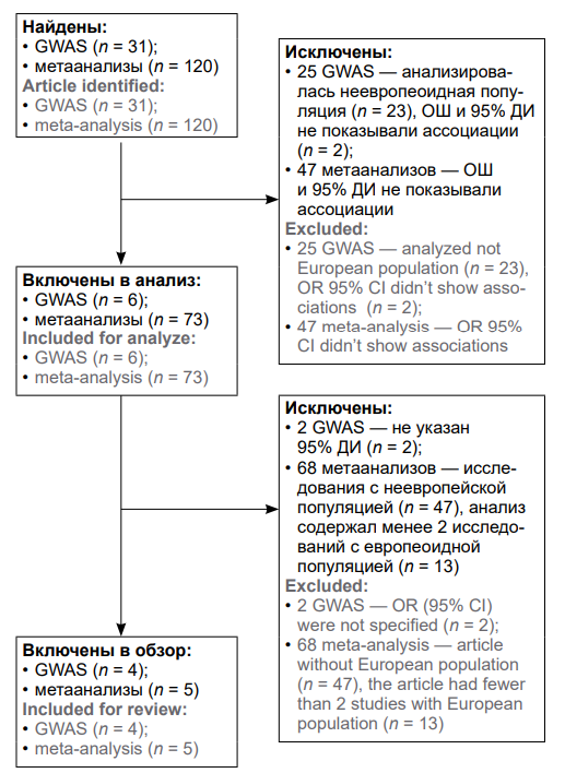 The study protocol was prepared following the PRISMA guidelines [6] and registered with PROSPERO — an international database of registered reviews in public health with a health-related outcome [7]. At the same time, our study does not meet some of the registration criteria on PROSPERO: For example, it is not connected directly with any treatment based on the review results. The identification of genetic risks offers an additional tool aimed to improve the awareness of healthcare providers so that they could use a personalized approach to disease prevention at the pre-symptomatic stage [4].