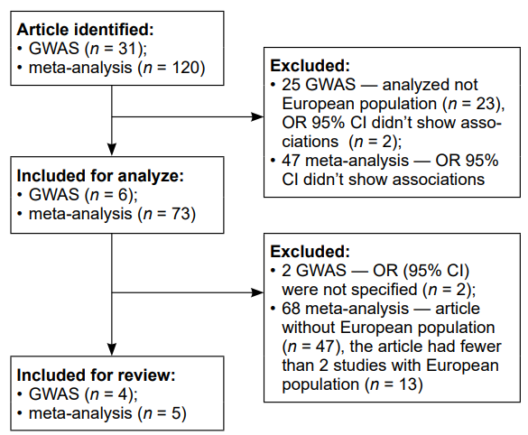 The search resulted in 4 GWAS and 5 meta-analyses, where the analysis of 40 SNPs was conducted (Figure).