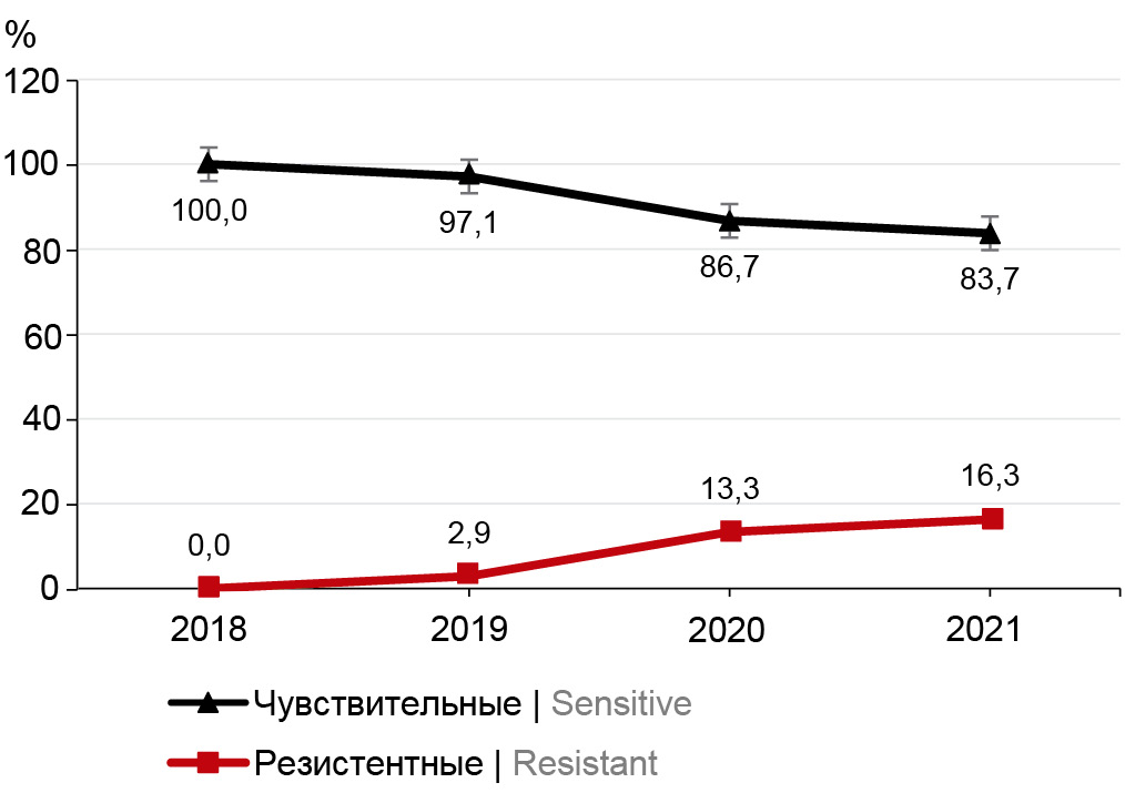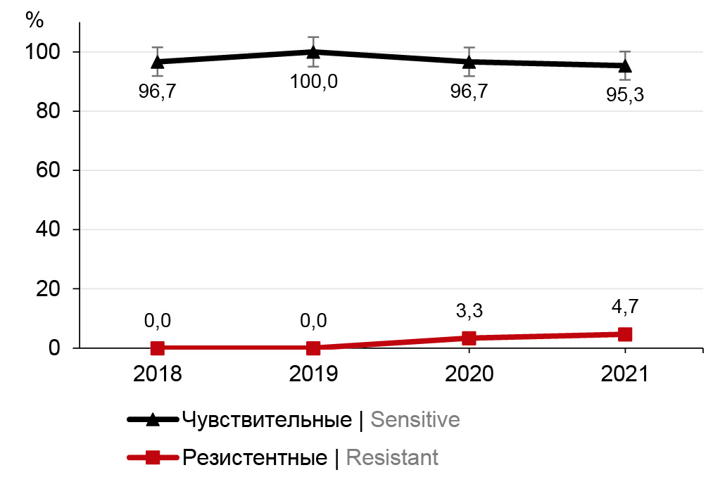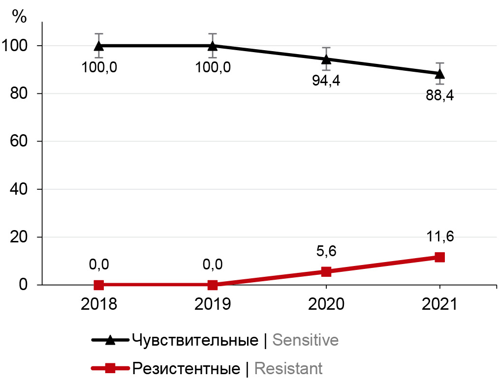 Standard methods of descriptive statistics and Microsoft Office Excel 2010 were used for the statistical analysis of the study results. The statistical significance of differences in percentages of resistant cultures was assessed using Student's t-test and the threshold value α < 0.05.