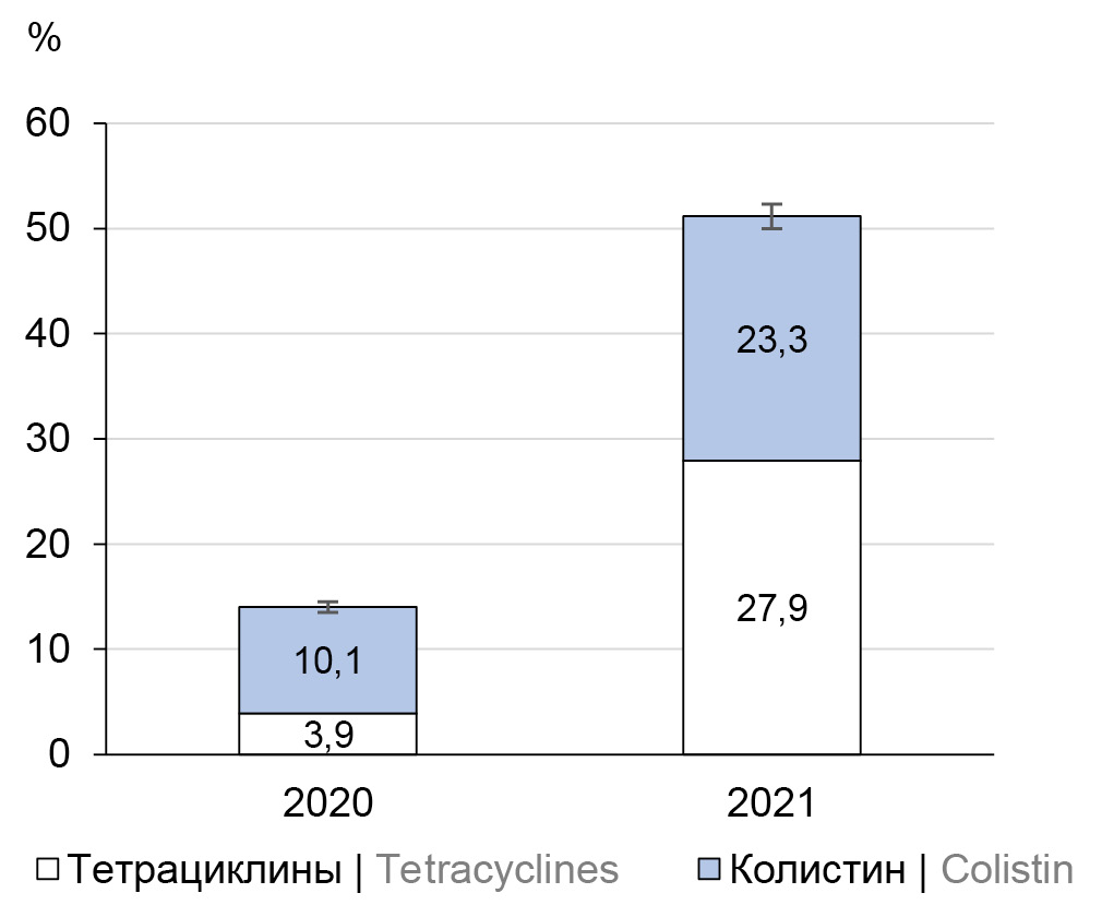 Fig. 5. Changes in the percentage of S. enterica cultures phenotypically resistant to colistin and tetracycline in 2020–2021