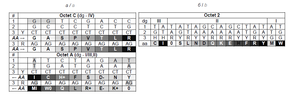 Fig. 4. Calligram A of the universal genetic code (a) and octet 2 of the calligram of the universal genetic code ([16]; b).The third nucleotide of the codon is represented by purine (R) or pyrimidine (Y). The start codon ATG and the stop codon TAR are highlighted vertically in grey. The first letters of central tetra-nucleotide codons of each octet are shown in bold. The tetra-nucleotide of the junction of octets A and C is also highlighted in grey. The successive increase in the molecular weight of the coding products (AC, amino acids) is shown by the increasing background density from white to black and by arrows. Roman numerals are used to denote degeneracy groups of the code, dg. Three pairs of coding products, some of which can bear a charge (that is why their positions in the lines are not stable and fixed following the dominant rule — the symmetry of the first letters of codons), highlighted in light grey