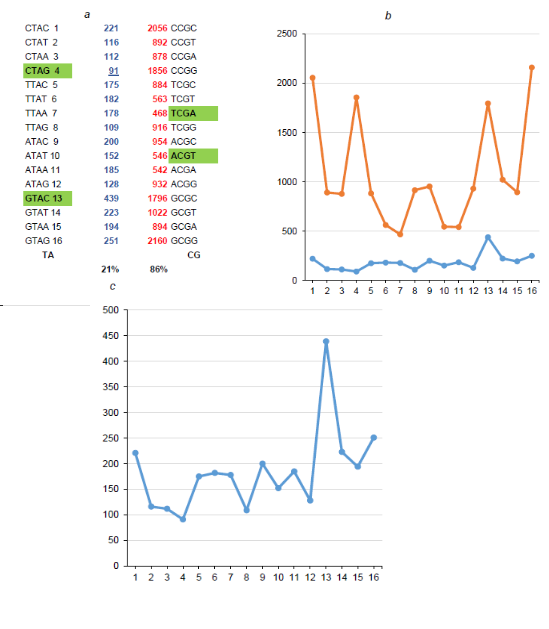 Fig.3. Frequency profiles of nATn and nGCn tetra-nucleotides in DNA of Ranid herpesvirus 1. a — absolute values; 3’-trimers TAG and CGA are highlighted in green and bold; 5’-trimers CTA and CCG are underlined; below — the percentage ratio of complete tetramers: ACGT:TCGA and GTAC:CTAG; b, c — a graphic representation of absolute values; c — nTAn, vertical scale up