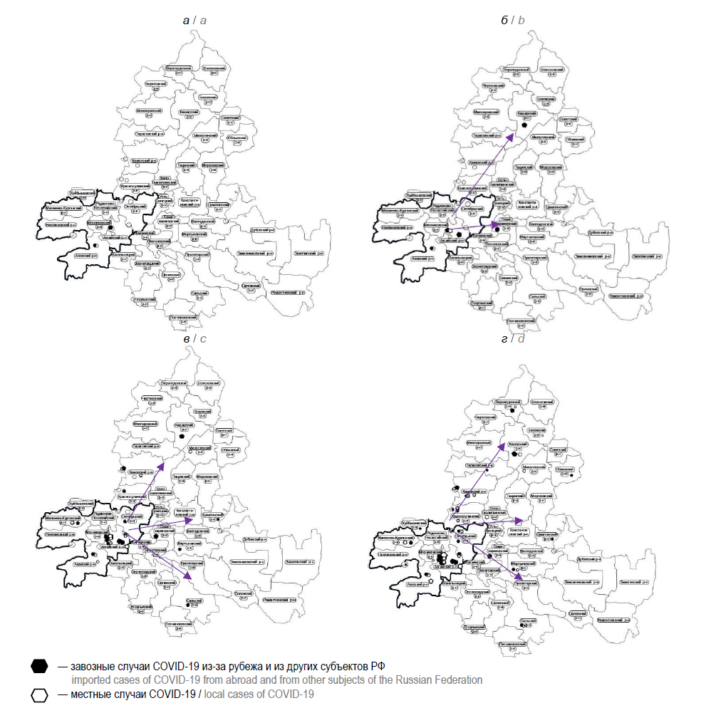 Results. In the period from 03/21/2020 to 03/28/2020, cases imported both from abroad and from other regions of the Russian Federation were registered in the Rostov Region, , mainly on the territory of the Rostov urban agglomeration. The vector of the spread of the disease was directed from the administrative center of the region to the periphery. The emergence of a new genetic line B.617.2 (Delta) probably led to a significant increase in the incidence in the Rostov Region.