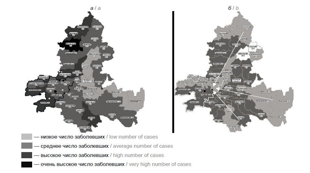 Изучение динамики числа заболевших в РО позволило установить, что в период с 09.01.2021 по 15.01.2021 зарегистрировано 2747 больных (65,4 ± 1,25 на 100 тыс. населения), что являлось максимальным значением на дату проведения данного исследования. Заболеваемость в данный период была обусловлена циркуляцией вируса SARSCoV-2, отнесённого к генетической линии B.1.1. Дифференциация территории РО по числу заболевших позволила выделить муниципальные образования с очень высоким (≥ 60 случаев COVID-19), высоким (40–59 случаев), средним (11–39 случаев) и низким (0–10 случаев) уровнями заболеваемости. В Ростовской городской агломерации к условной группе территорий с очень высоким уровнем заболеваемости отнесены города Шахты, Таганрог, Новошахтинск, Батайск, Ростов-на-Дону, высоким — Новочеркасск, Неклиновский и Азовский районы и средним — Азов. Среди не вошедших в Ростовскую городскую агломерацию муниципальные образования распределились по уровню заболеваемости следующим образом: очень высокий — Миллеровский район, высокий — города Волгодонск и Гуково, Чертковский, Верхнедонской, Куйбышевский, Белокалитвинский, Красносулинский, Сальский районы; средний — 28 районов, города Донецк и Каменск-Шахтинский, низкий — 6 районов и г. Зверево (рис. 3, а).