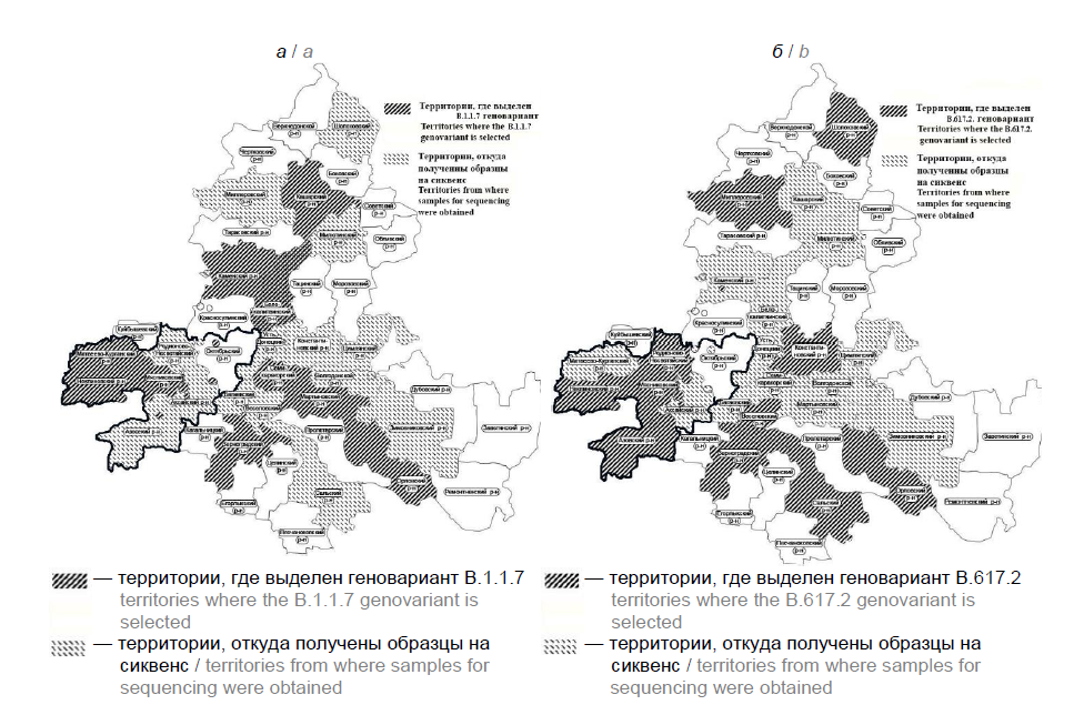 Всего на 07.07.2021 с помощью метода полногеномного секвенирования исследовано 155 проб из 32 муниципальных образований РО, из них в 27 (17,4%) пробах возбудитель идентифицирован как геновариант B.1.1.7 (рис. 4, а), в 50 (32,3%) — как B.617.2 (рис. 4, б).