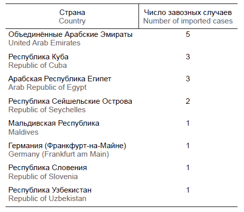 Эпидемиологическая ситуация в РО имеет ряд особенностей. Так, число завозных случаев с 03.05.2021 по 30.05.2021 (2 инкубационных периода) превышает таковое на начало эпидемических проявлений на территории РО (таблица). В указанный период зарегистрировано 17 случаев завоза из стран, преимущественно туристических направлений. Вероятно, эта ситуация обусловлена возобновлением международных транспортных сообщений между Российской Федерацией и рядом зарубежных государств8 с трудовой, туристической и образовательной9 10 целями, а также с началом сезона отпусков.