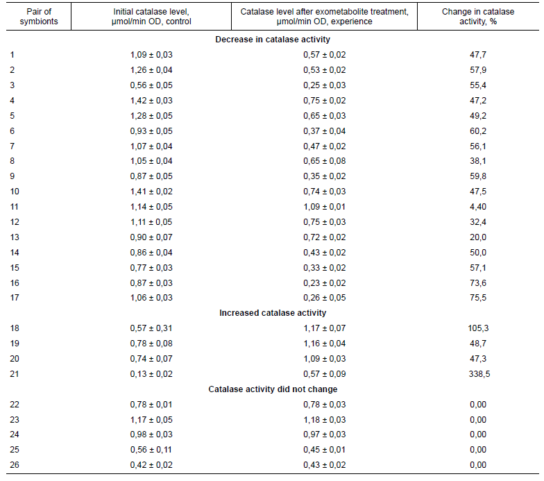 Results. Klebsiellas decrease the intensity of germ tube formation in C. albicans by 58.7% (p < 0.01). When cocultured, 12.3% of the yeast cells produce germ tubes, while 29.8% of transformed cells was detected in the fungal monoculture. It has been found that exometabolites of 65.7% of E. faecalis strains decrease production of catalase in C. albicans. The initial catalase level in untreated cultures of C. albicans averages 1.02 µmol/min of optical density; after they are treated with E. faecalis exometabolites, the level decreases to 0.55 µmol/min, i.e. by 46.1% (p < 0.05).