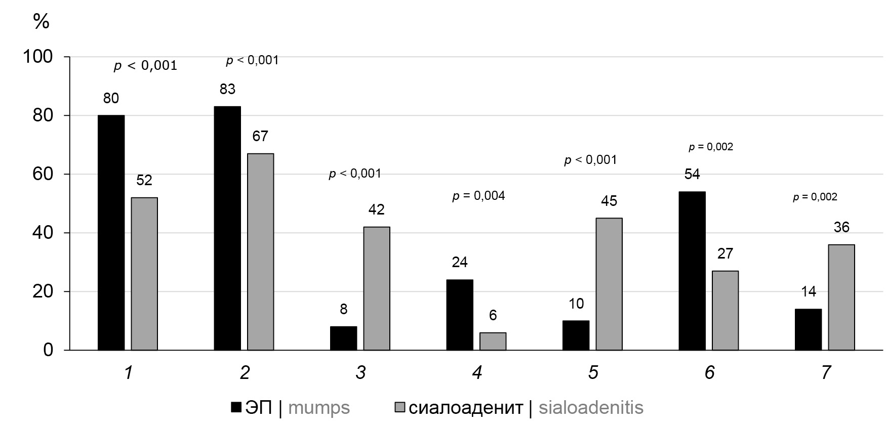 Наиболее характерные клинические проявления ЭП и НСА представлены на рис. 1. При ЭП достоверно чаще в сравнении с НСА имели место ярко выраженные клинические симптомы: слабость (χ2 = 44,2; р < 0,001), поражение околоушных слюнных желёз с обеих сторон (χ2 = 27,1; р < 0,001), боль в околоушных областях (χ2 = 13,6; р < 0,001), сухость во рту (χ2 = 21,9; р < 0,001), фебрильная температура (χ2 = 12,2; р < 0,001), орхит (χ2 = 14,1; р < 0,001).