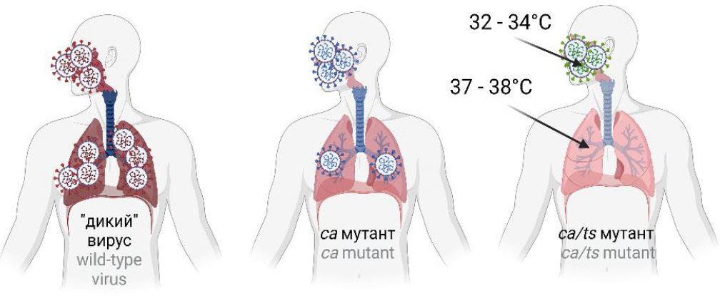 Fig. 1. Virulence of the wild-type, cold-adapted (ca) and temperature-sensitive (ca/ts) strains of the respiratory virus. The wild-type strain can affect the upper and lower respiratory tract, causing pneumonia, while the ca-strain primarily affects the upper compartments, and ca/ts affects only the upper compartments of the respiratory tract.