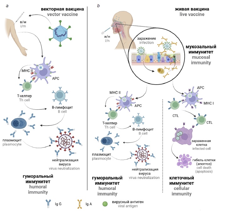The protective activity of live-attenuated vaccines for intranasal application (mucosal vaccines) employs the same mechanisms that participate in the development of acquired immunity during natural infection (Fig. 2, b). When the respiratory virus enters nasal and/or oral cavities, the lymphoid tissues associated with the mucosa of the respiratory and digestive tract turn into the first line of defense against viral infection. This process involves all components of innate upper respiratory immunity - cellular (neutrophils, macrophages, dendritic cells, resident microfold M cells, innate lymphoid cells, natural killer cells and mast cells) as well as soluble molecules (galectins, collectins, cytokines, etc.). The activation of the first line of defense is followed by activation of dendritic cells in the focus of infection; they take up, process and present viral antigens. Such activated dendritic cells "loaded" with viral antigens migrate to regional lymph nodes; antigens are presented to naïve T cells, thus triggering their further differentiation and activation of adaptive immunity, which is accompanied by production of cytotoxic T cells and helper T cells. Specific naïve B cells recognize viral antigens either without any assistance or when they are presented by follicular dendritic cells as an antigen-antibody complex in a Fc-receptor-connected manner. The interaction of activated helper T cells and B cells triggers the humoral immune response. The simultaneous expansion of CD4+ helper T cells, CD8+ cytotoxic T cells in the focus of infection and production of antibodies by plasma cells is of critical importance for elimination of the virus [41, 47, 48]. The combined activation of humoral and cellular components of the systemic and mucosal immune protection can provide effective protection against infection with SARS-CoV-2 [47].