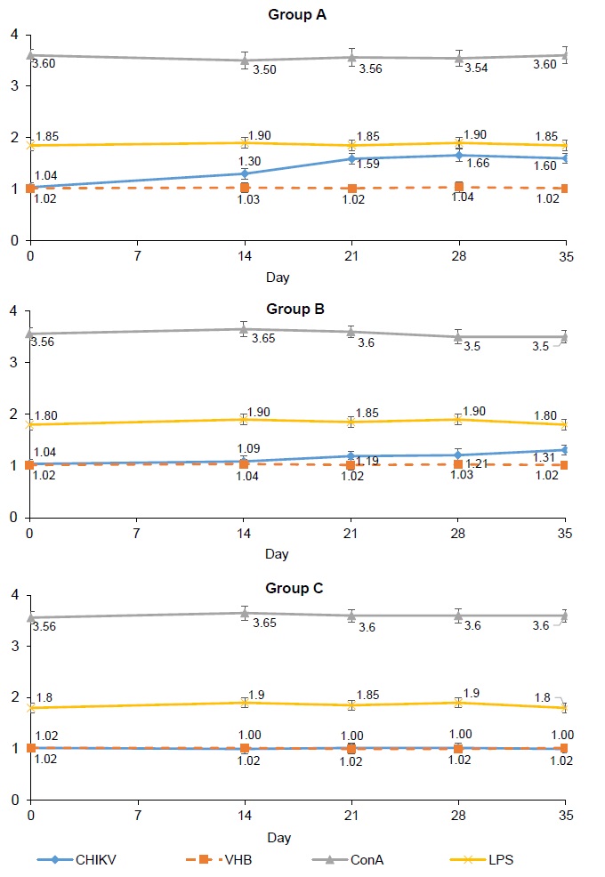 In response to stimulation with mitogens (concanavalin A and lipopolysaccharide), splenocytes from animals of all groups showed pronounced proliferation, which was significantly higher than that with viral antigens at all periods of observation (p < 0.05). The index of stimulation (IS) of splenocytes of animals in group A was statistically higher, starting from the 7th day after the 2nd immunization and up to the end of observation, (p < 0.005 on the 21st and 28th days; p < 0.05 on the 35th day) relative to the similar indicators in animals in group B. The statistically significant difference between the IS of splenocytes by CHIKV antigen in animals of groups A and B at all observation periods after the 2nd immunization indicates not only the specificity of the proliferative response of splenocytes in immune animals, but also a dose-dependent effect. Splenocytes of non-immune animals of group C responded with a pronounced proliferation to stimulation with only T- and B-cell mitogens (concanavalin A and lipopolysaccharide), while IS did not change upon stimulation with viral antigens at all observation periods (Fig. 1).