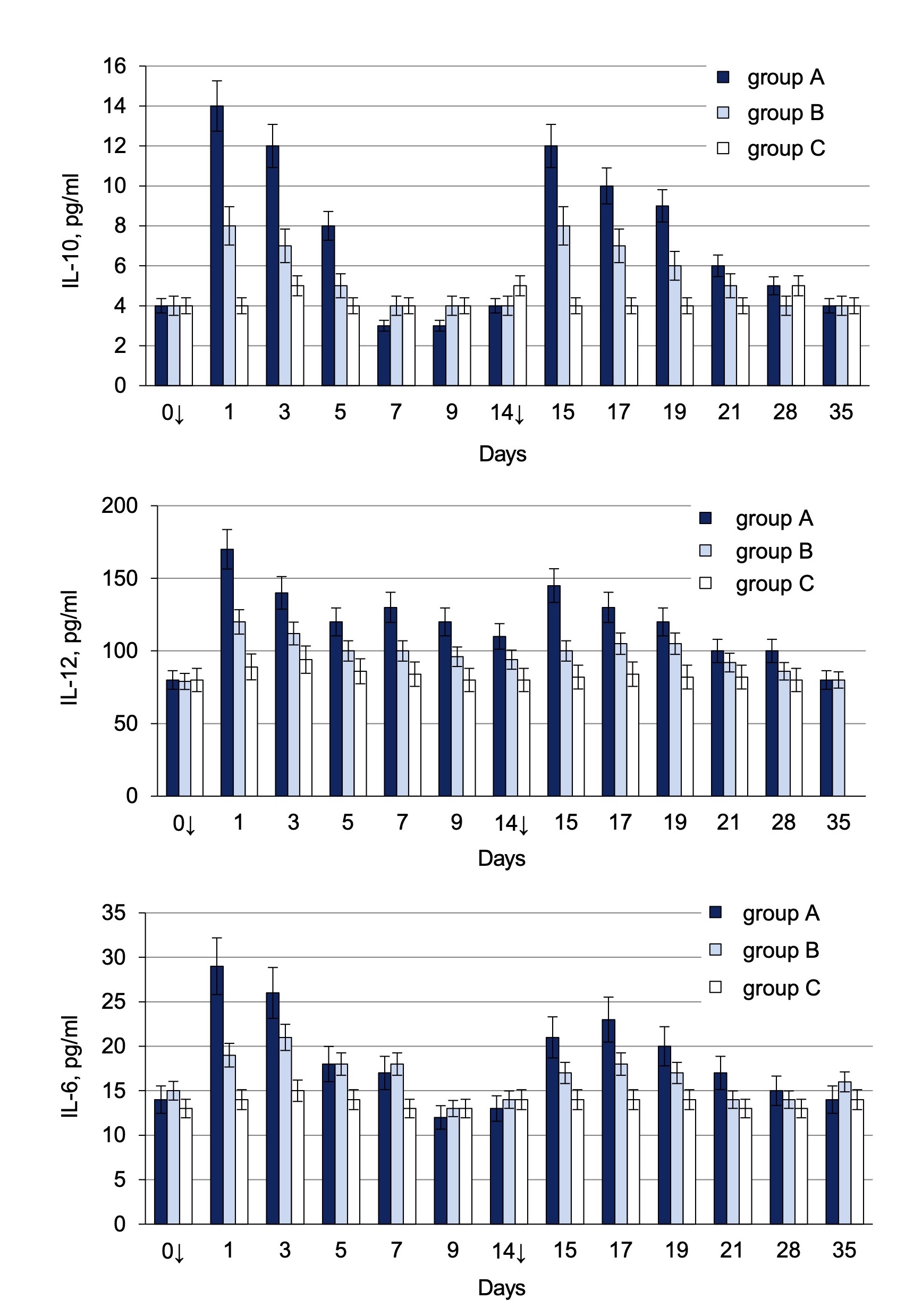 Fig. 2. Dynamic of cytokines IL-6, IL-10, IL-12 in C57Bl/6 mice’ sera immunized with the different doses of inactivated CHIKV. Here and on Figs. 3, 4: arrow — day of immunization; animals were bled on days 0 and 14 for the specific immunity testing before antigen administration.