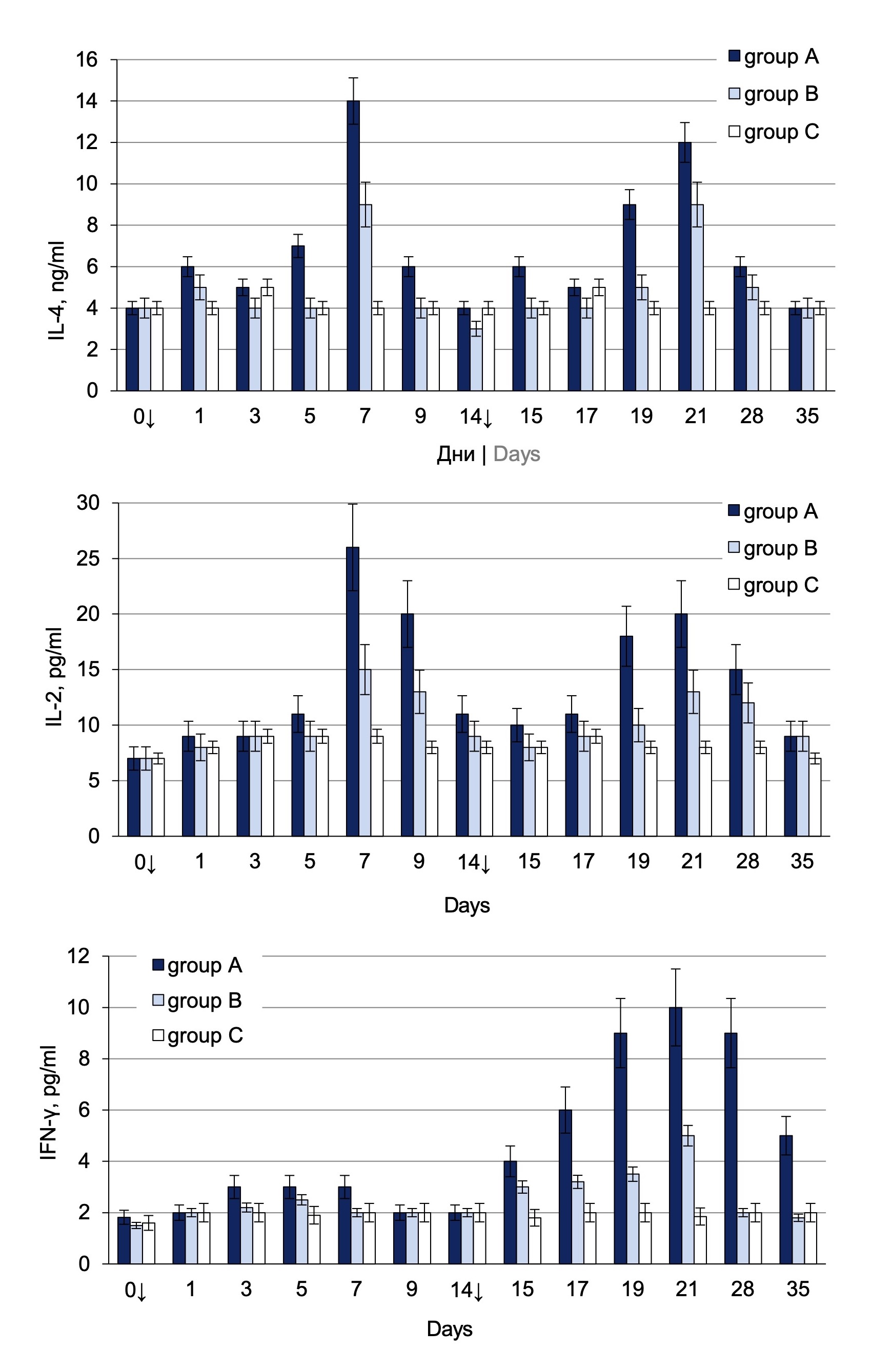 Fig. 4. Dynamic of cytokines IL-2, IL-4 and IFN-γ in C57Bl/6 mice’ sera immunized with the different doses of inactivated CHIKV.