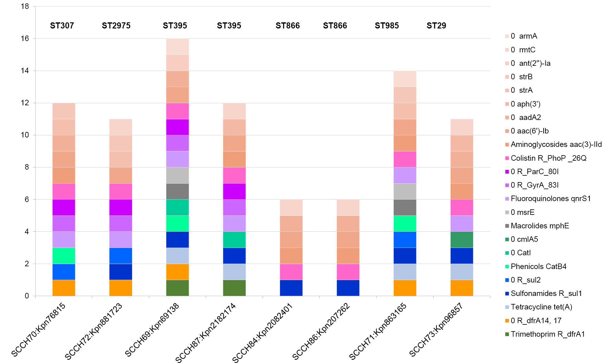 Resistance genes to other antibiotic categories are shown in Fig. 2. A minimum of 6 additional resistance genes were detected in ST866 isolates. Among them there are no resistance genes to fluoroquinolones and trimethoprim, which confirms the phenotypic data. The maximum number of additional genes in isolate ST395 P8 is 16. Along with isolate ST985 (14 genes), they have at least one resistance-determining gene for each category of antibiotics. It is important to note that only the leading isolates have macrolide resistance genes.