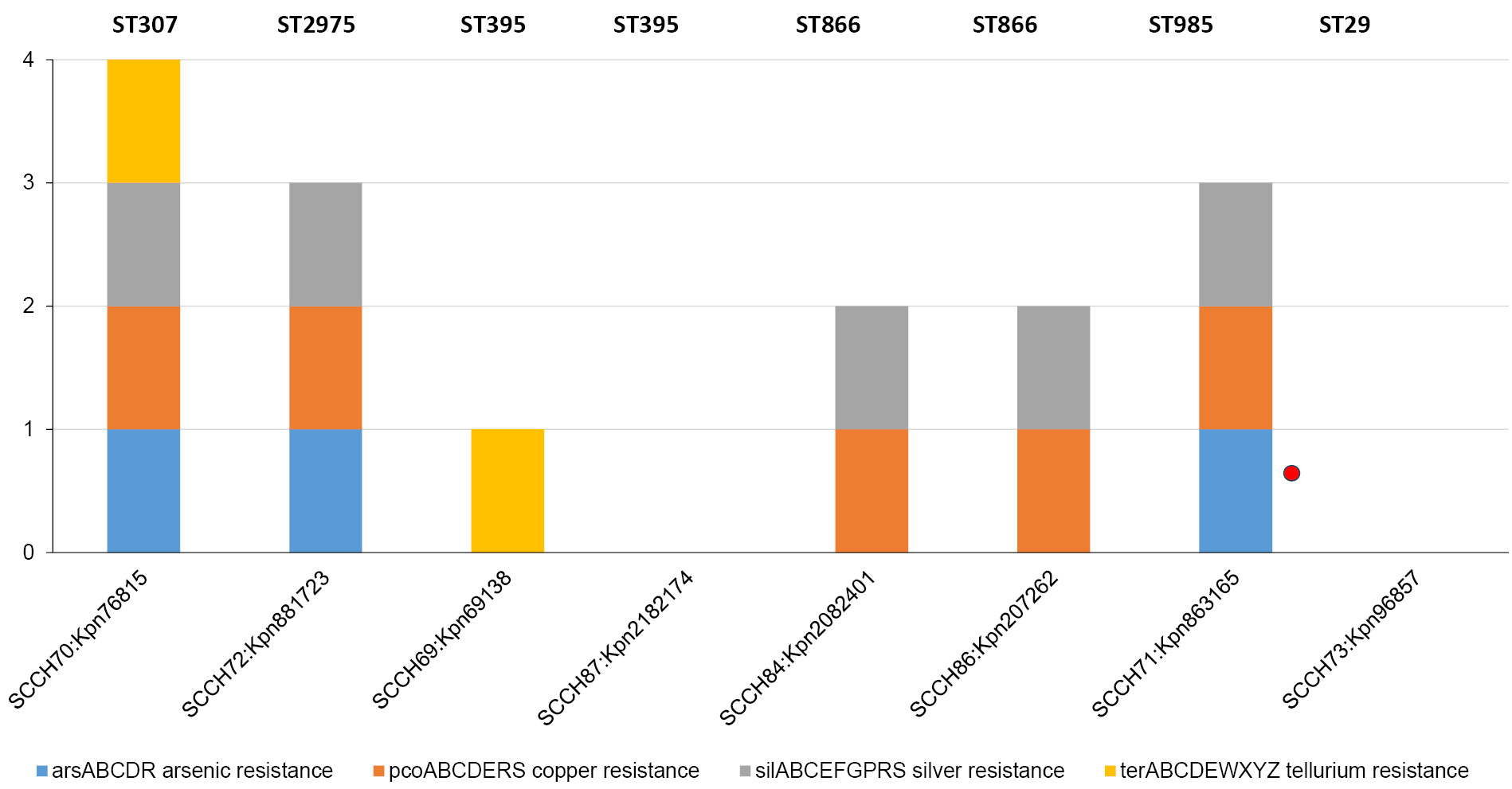 Heavy metal ion resistance genes were found in 6 out of 8 genomes (Fig. 3). These are resistance operons to arsenic (arsABCDR), copper (pcoABCDERS), silver (silABCEFGPRS), and tellurium (terABCDEWXYZ). All 4 operons are present in the ST307 genome, 3 each in the ST2975 and ST985 genomes, 2 each in ST866, with only the tellurium resistance operon being present in the ST395 P8 genome.