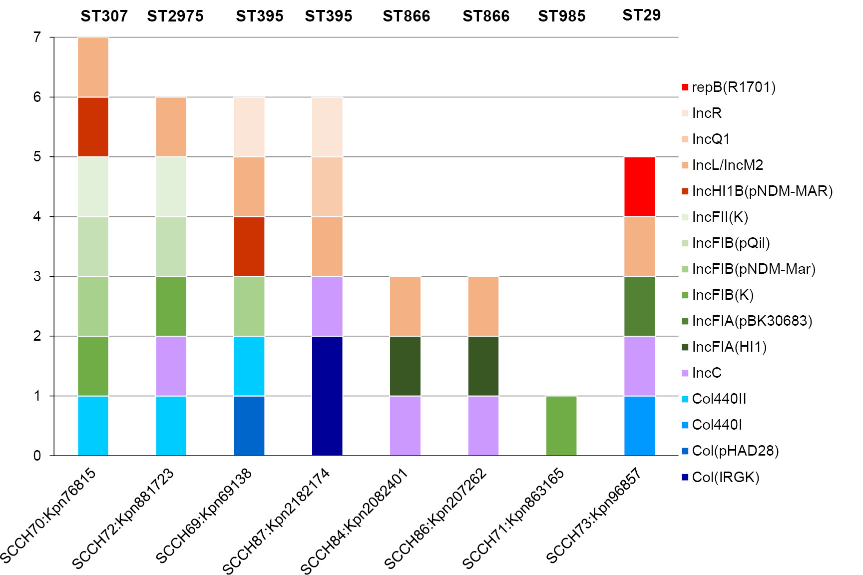 Plasmids of resistant isolates. Typically, heavy metal operons and many resistance genes are present in plasmids [29]. We estimated the number of Inc plasmid groups for the genomic data of each isolate (Fig. 4). The maximum number of Inc was found in isolate ST307 (7) and the minimum in isolates ST985 (1) and ST866 (3). The data confirm the presence of plasmids in the genomes of all isolates.