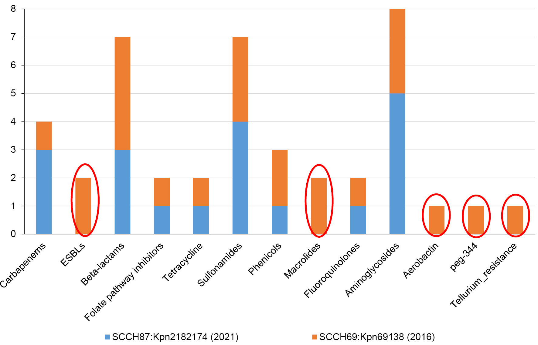 Fig. 5. Resistance and virulence genes in K. pneumoniae ST395 plasmids. Circled are factors that are present only in the plasmids of the ST395 P8 isolate.