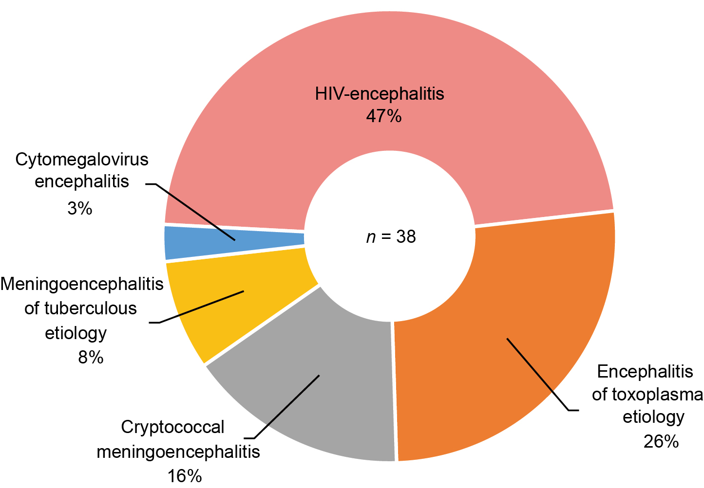 Among the patients studied (n = 38), the most common brain lesions were meningoencephalitis and encephalitis associated with opportunistic infections and tuberculosis, 20 out of 38 cases (52.6%; 95% CI 37.3–67.5), among which encephalitis of toxoplasma etiology predominated, 10 out of 20 cases (50.0%; 95% CI 29.9–70.1). HIV encephalitis was identified in 18 of 38 cases (47.4%; 95% CI 32.5–62.7; Figure 1).