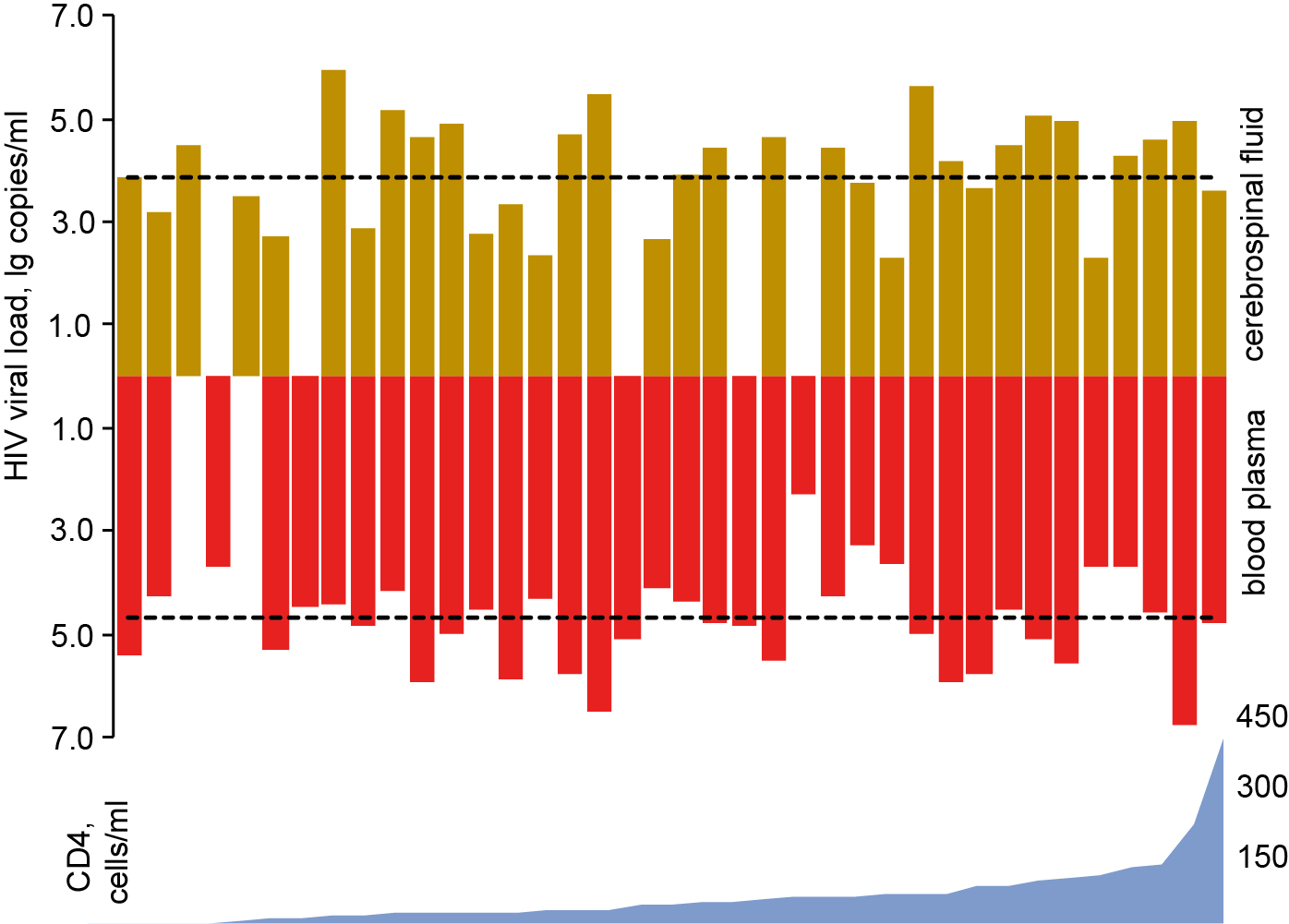 A statistically significant weak correlation between the HIV viral load level in plasma and CSF was revealed. The HIV viral load in blood plasma exceeded the values in CSF by 0.8 lg, or 6.3 times.