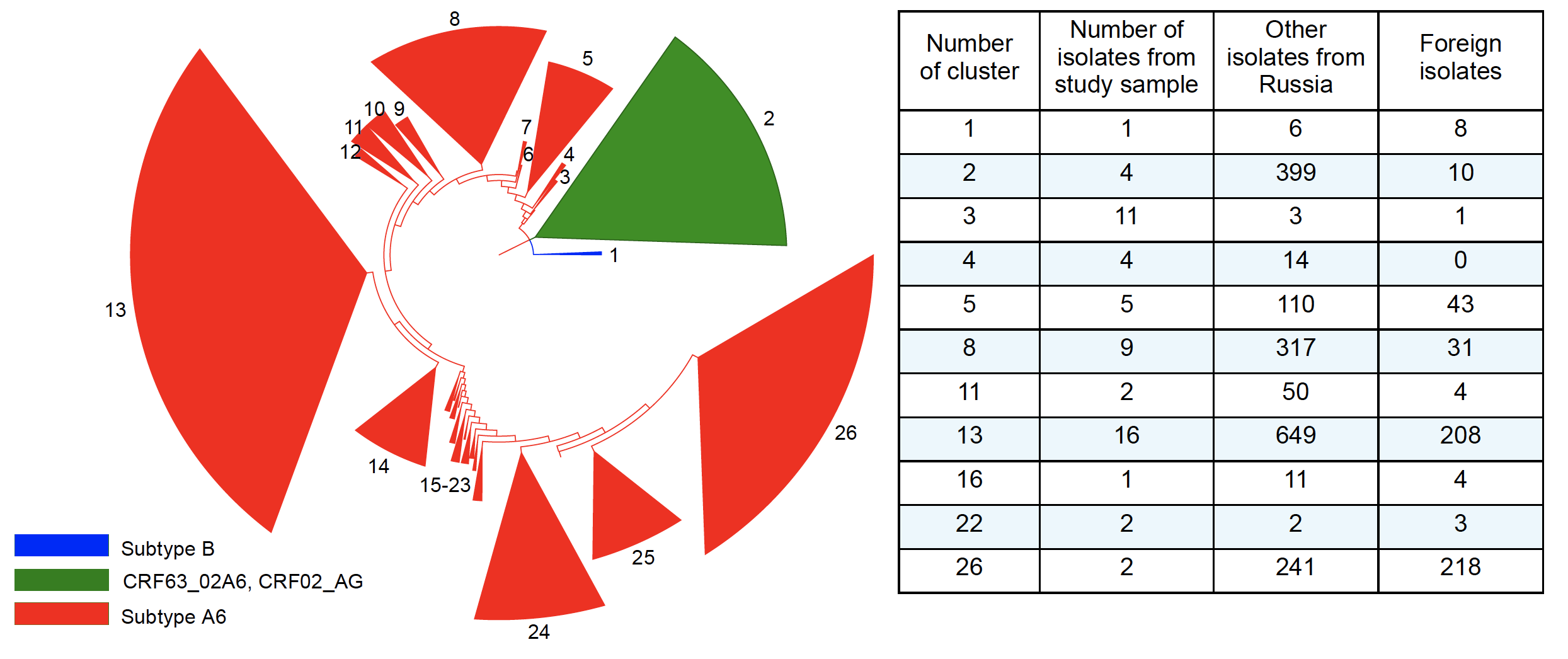 Phylogenetic analysis of 2929 HIV-1 pol gene fragments encoding a protease and part of a reverse transcriptase was performed by maximum likelihood analysis using the GTR+G nucleotide substitution model and 500 bootstrap replications. As a result, 26 clusters were formed, 11 of which included 57 HIV strains isolated from the studied patients (Fig. 3).