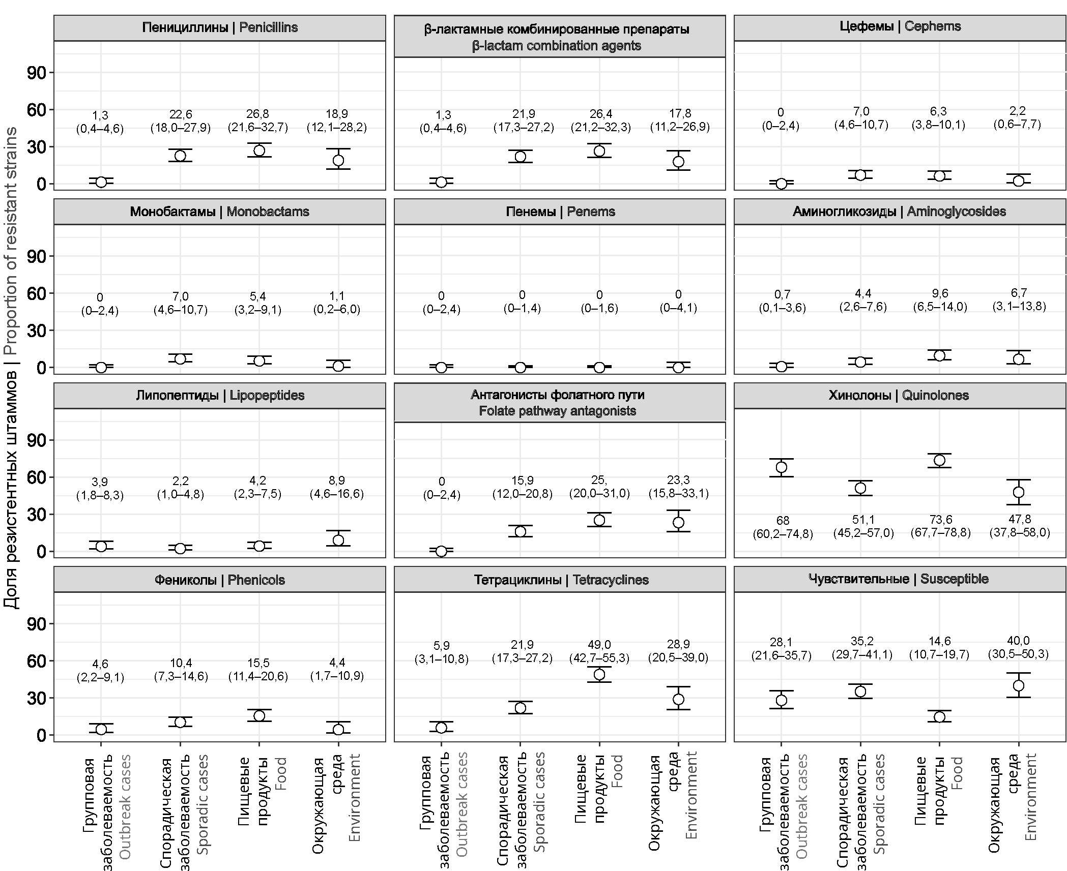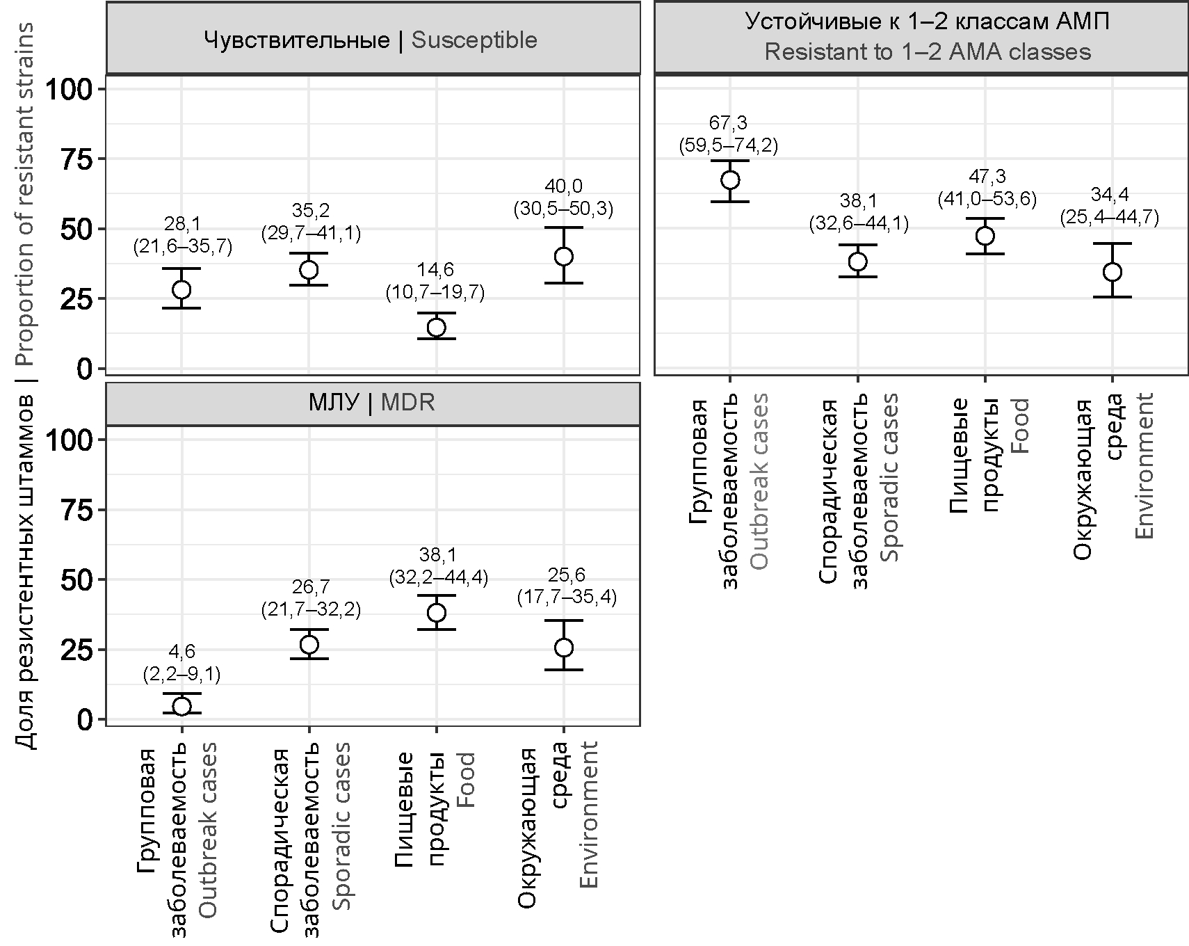 Comparative analysis of data on antibiotic bacterial resistance of Salmonella obtained in Russia in different years involves certain difficulties. One of the main reasons is continuously changing interpretation criteria and methodological approaches to testing for antibiotic bacterial resistance. These changes are occurring around the world, making it difficult to conduct an objective analysis [10]. According to previous studies, the percentage of non-typhoidal Salmonella strains resistant to various AMA classes varied significantly across different regions of Russia in different years. Resistance to aminoglycosides was shown by 1–2% to 53.1% of strains, to quinolones — from 0.0% to 59.2%, to penicillins — from 26.4% to 42.0% [11–14]. Another important factor is the limited number of studies in Russia reflecting a comprehensive analysis of the phenotypic resistance of non-typhoidal Salmonella strains in terms of the diversity of sources and geography of isolation, as well as the serotype diversity.