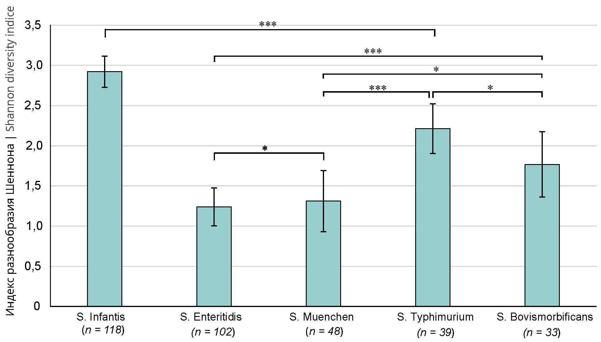 Fig. 2. Distribution of Shannon diversity indices (indicating 95% CI) for Salmonella serotypes not associated with outbreaks and with the largest number of resistance profiles. * — slightly different in diversity (p > 0.05); *** — significant difference (p < 0.05).