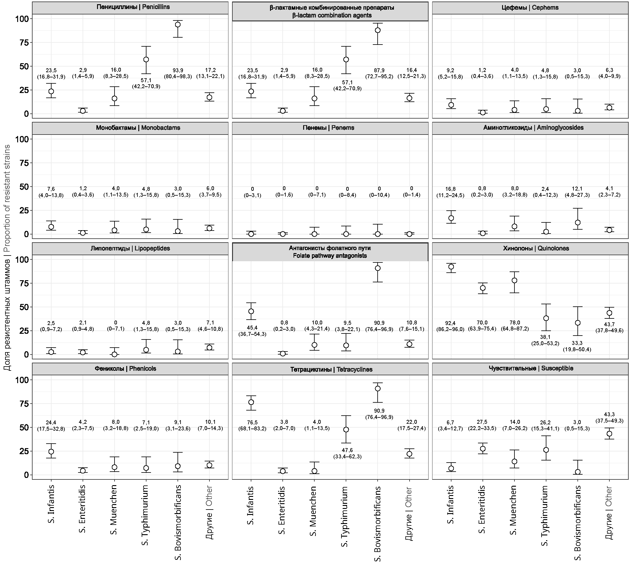 The resistance of strains of all analyzed serotypes to cephems, monobactams, and lipopeptides did not exceed 10%. The proportion of strains resistant to aminoglycosides also remained low, less than 10% , and only for S. Infantis (16.8%; 95% CI 11.2–24.5) and S. Bovismorbificans (12.1%; 95% CI 4.8–27.3) this indicator was higher.