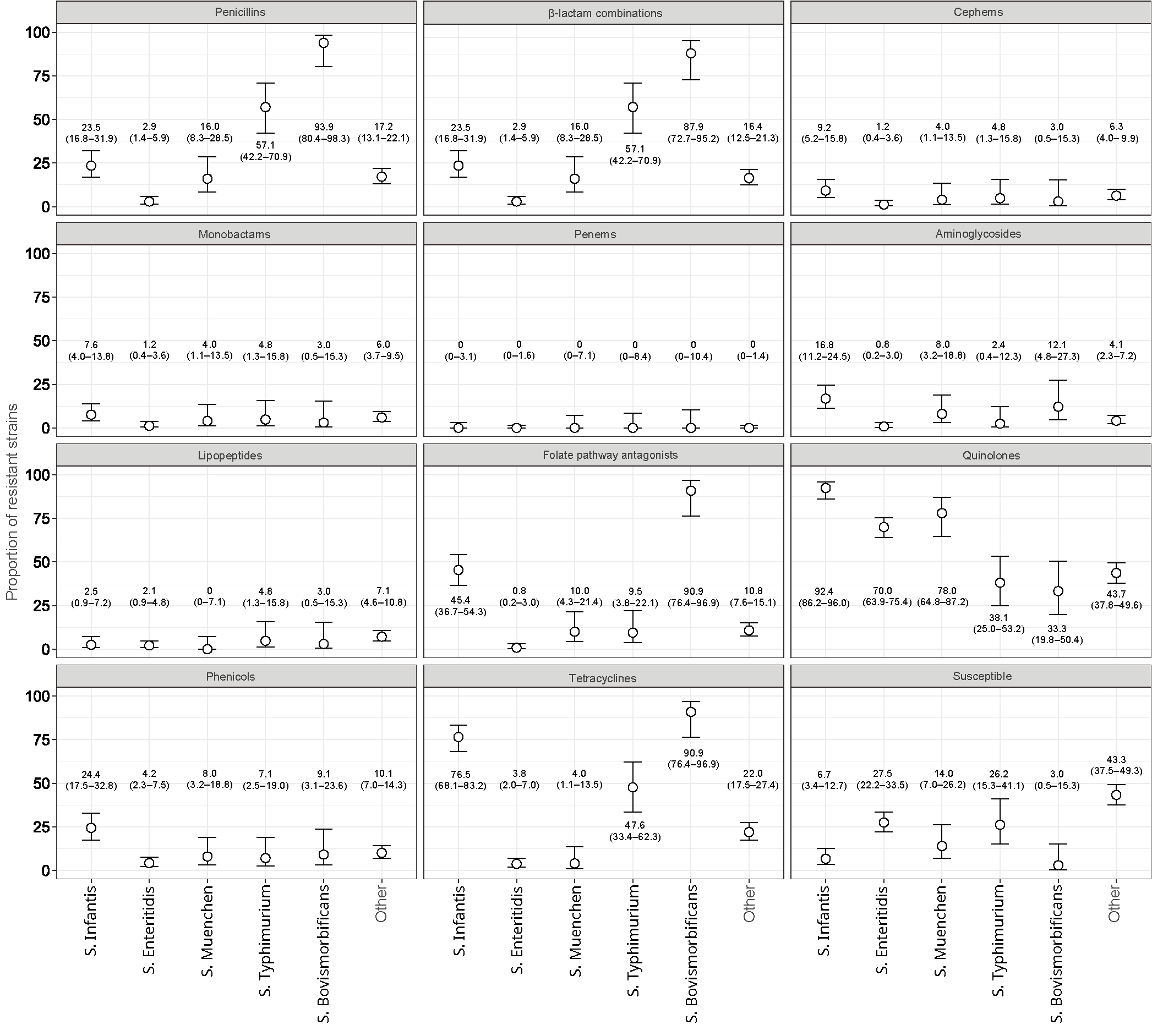 - Infantis strains differed from other serotypes by their high resistance to quinolones (92.4%; 95% CI 86.2–96.0) and phenicols (24.4%; 95% CI 17.5–32.8), and also showed increased resistance to folate pathway antagonists (45.4%; 95% CI 36.7–54.3) and tetracyclines (76.5%; 95% CI 68.1–83.2).