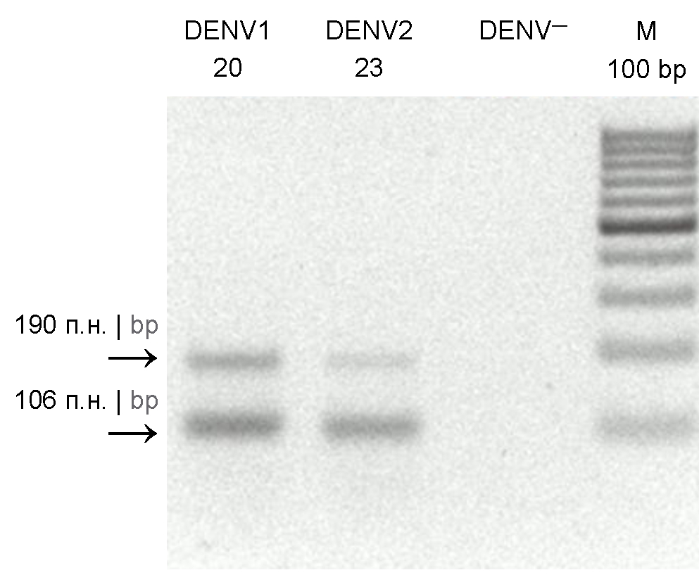 As can be seen from the electropherogram of amplicons (Fig. 1) obtained using universal primers for all the 4 types of the dengue virus, the amplification produces 2 amplicons 190 and 106 bp long. The sequencing of fragments showed that both of them were specific [15, 16].