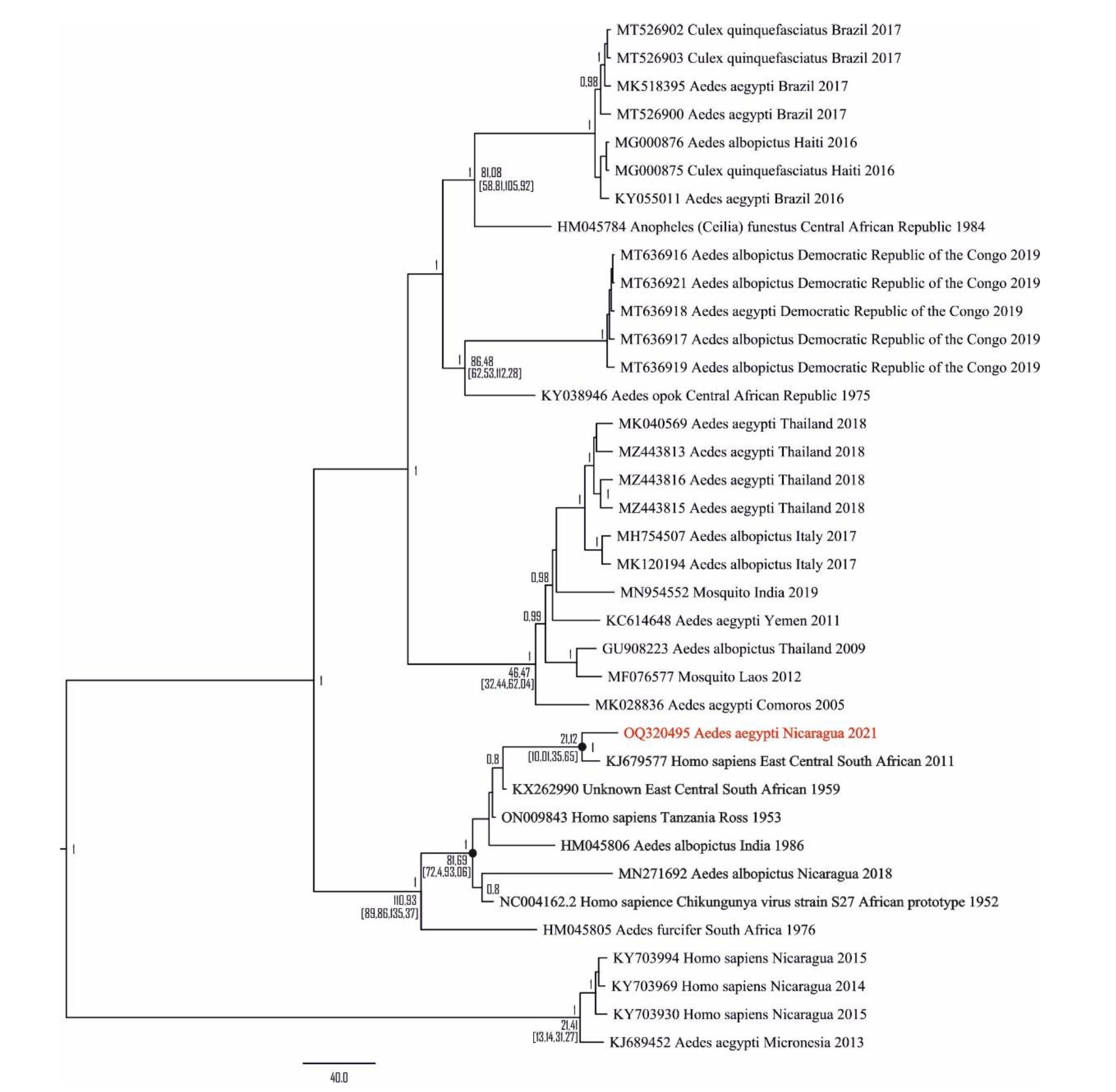 The phylogenetic analysis was conducted using the molecular dating method, the BEAST v. 1.10.4 software package and the associated software suite BEAUti v. 1.10.42. When constructing trees, we used the HKY3 nucleotide substitution algorithm with a strict molecular clock. The analysis included 10 million trees, every 1,000th tree was selected. The MEGA11 software was used for tree construction. The multiple alignment was performed using genetic sequences of genome fragments (E2, 6K, E1) of CHIKVs isolated from mosquitoes (30 sequences) in different regions of the world. The position in the genome fragment, which was used for the phylogenetic analysis, was 8574–11 303 bp (the positions are shown for the prototype strain isolated in 1959, GenBank KX262990). The phylogenetic tree was extended with 8 nucleotide sequences of CHIKV isolated from humans, 3 of which were obtained from patients in Nicaragua in 2014 and 2015, and 4 of them were reference sequences of the virus.