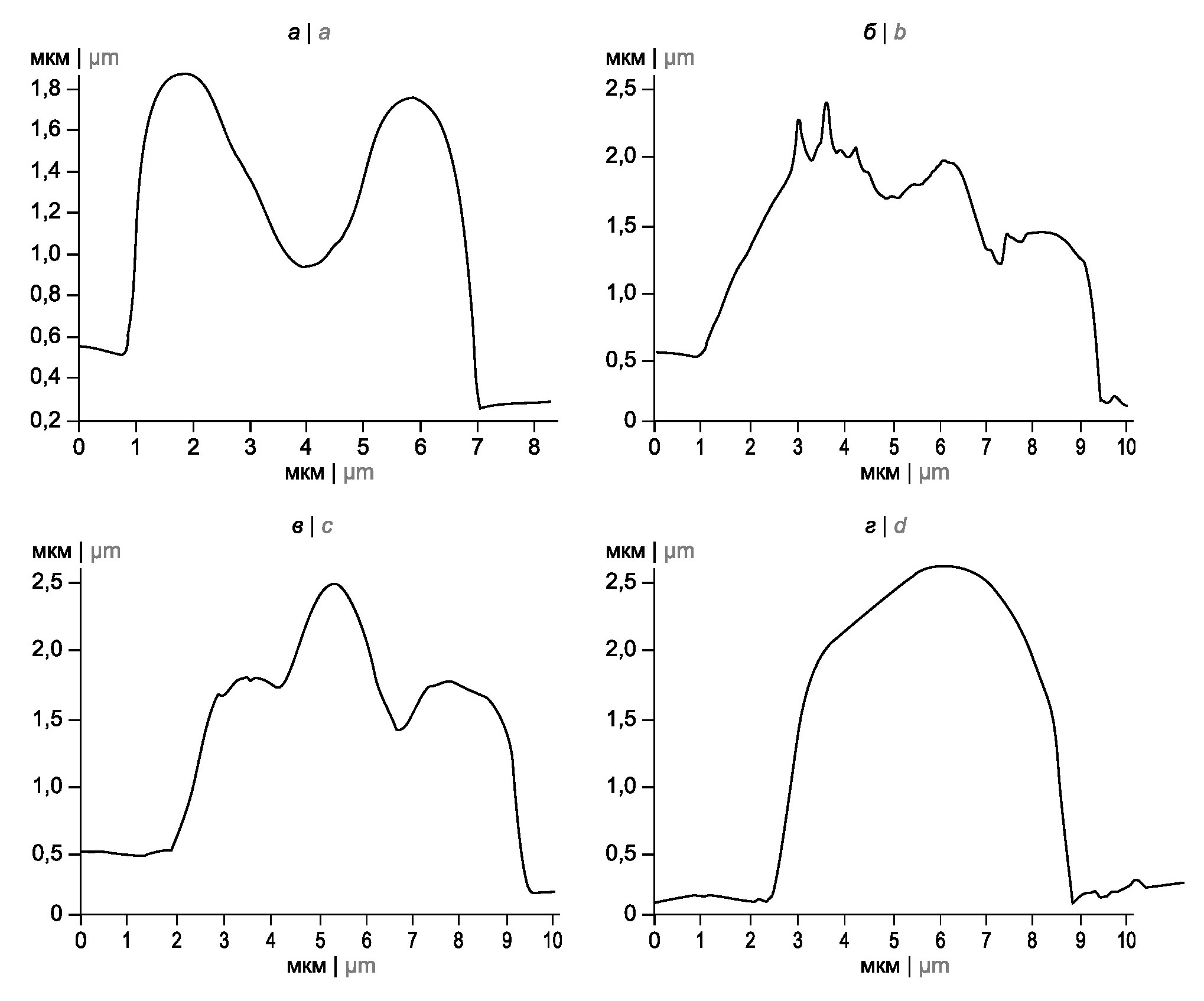 Атипичные формы клеток, которые появлялись в результате воздействия штаммов Y. pestis, — это эхиноциты (рис. 2, б, в), сфероциты (рис. 2, б), кодоциты (рис. 2, г) и плоские клетки. Анализ гистограмм нормальных эритроцитов и трансформированных форм (ТФ) показал, что у неизменённых форм типичный двояковогнутый профиль клетки на кривой сечения представлен двумя равномерными синусоидами (рис. 3, а), в то время как у ТФ были выявлены выраженные изменения структуры мембранной поверхности. Любое нарушение в рельефе эритроцита отражалось на изменении профиля клетки, представленного в гистограммах (рис. 3, б–г).