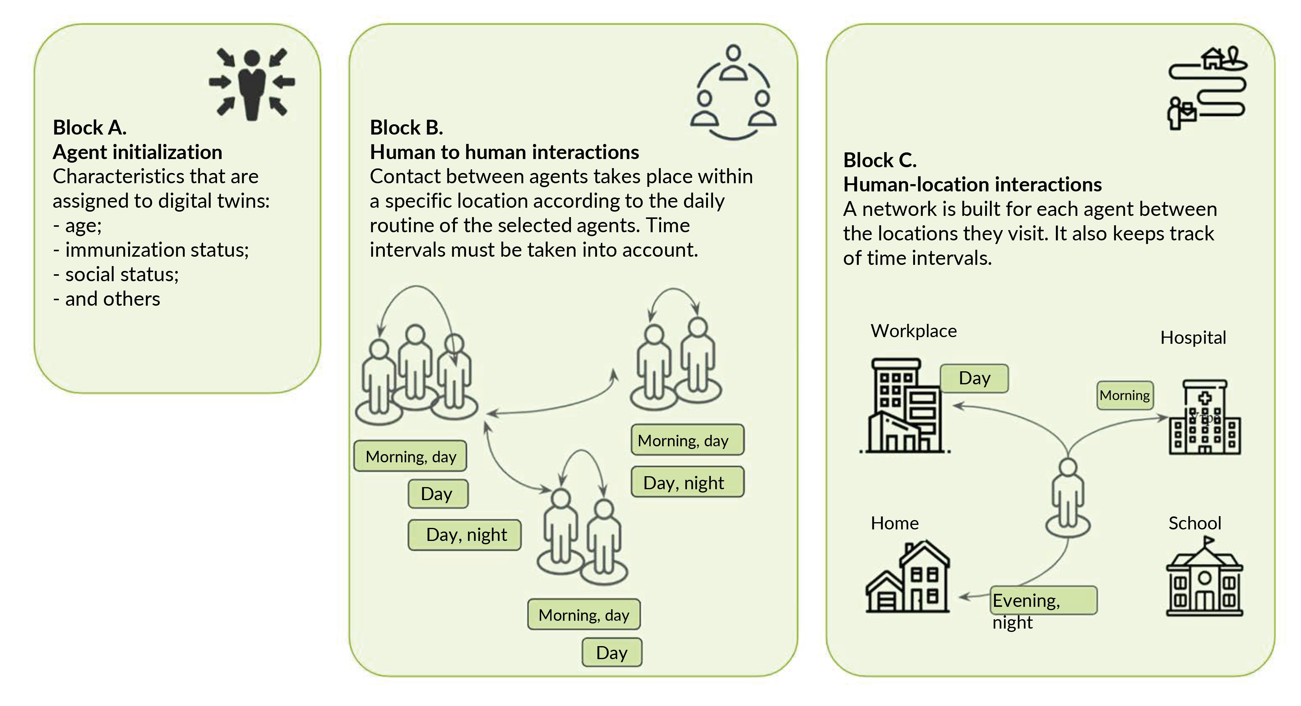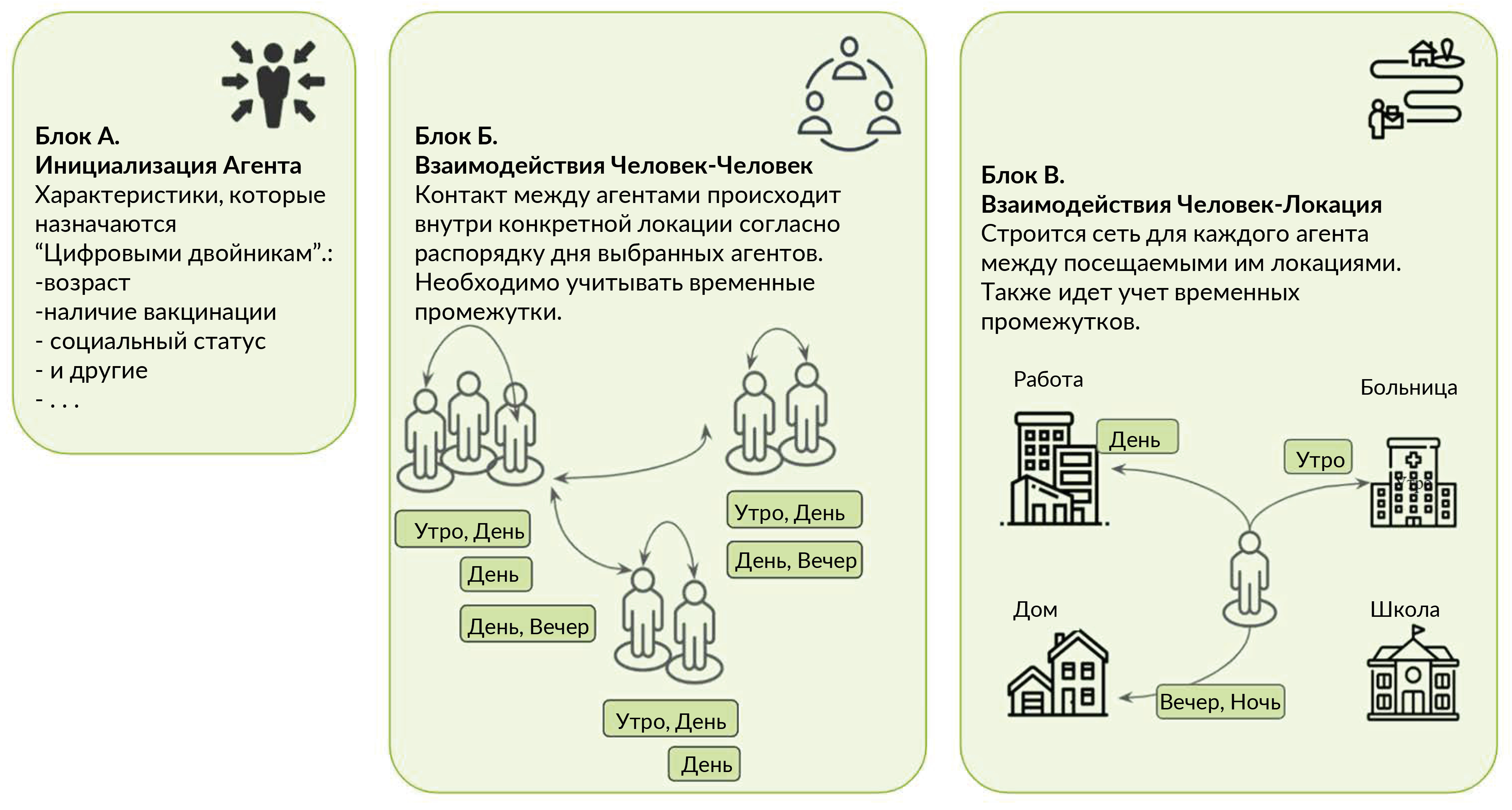 Fig. 1. The artificial population consists of agents with different demographic characteristics (block A). These agents are assigned specific tasks to perform at specific locations and times. This determines a network that connects agents to locations throughout the day, creating a person-location network (Block В). The person-to-person contact network (Block Б ) is developed based on the interactions obtained from the person-to-location graph.