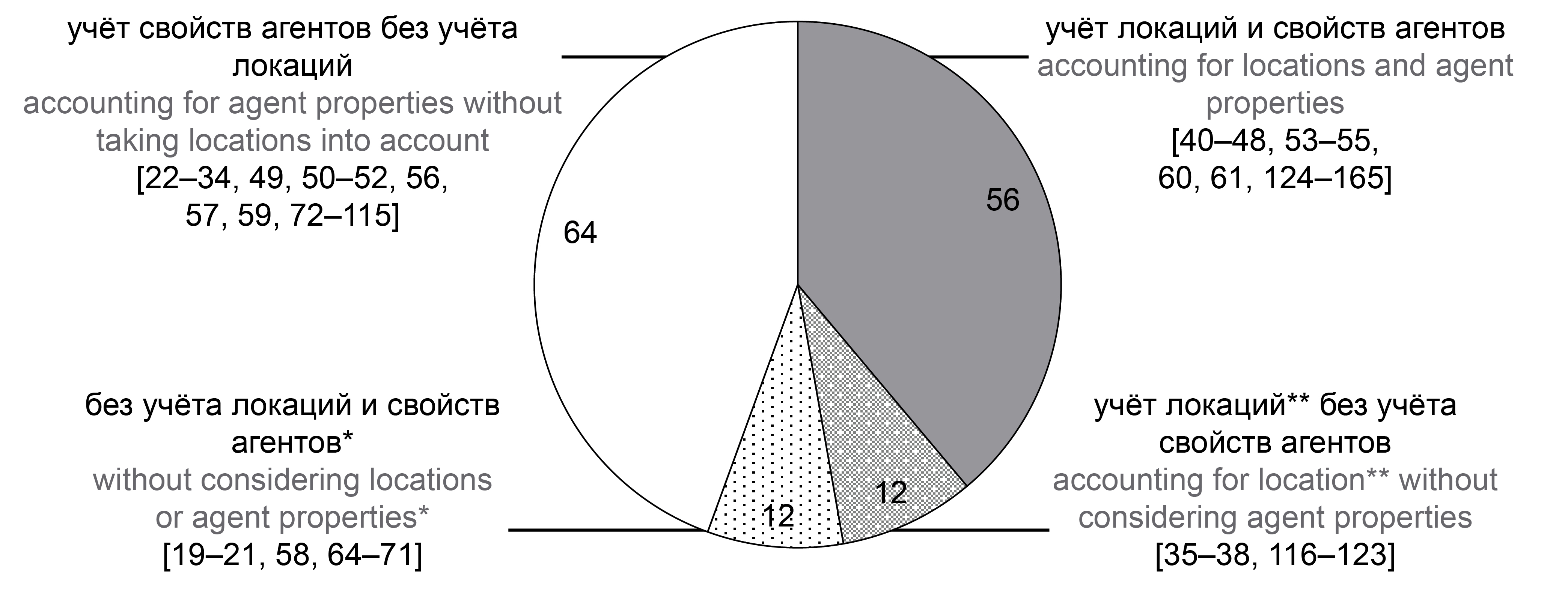 According to the search methodology, 144 studies published in international journals in English were selected and used for further analysis. No Russian-language publications meeting the selection criteria were found. The selected publications were systematized according to the ways of setting the AP by the criteria "location" (space consideration) and "agent properties". The agent's properties included such characteristics as gender, age, field of activity, ethnicity, income, and the like — i.e., characteristics determined on the basis of demographic and statistical data. We considered that the model accounted for locations if the probability of transmission depended on the agent's spatial location. This property of the model can be realized both by tracking the coordinates of each agent in the modeled space and by modeling individual spatial entities (e.g., store, school) that may house agents.