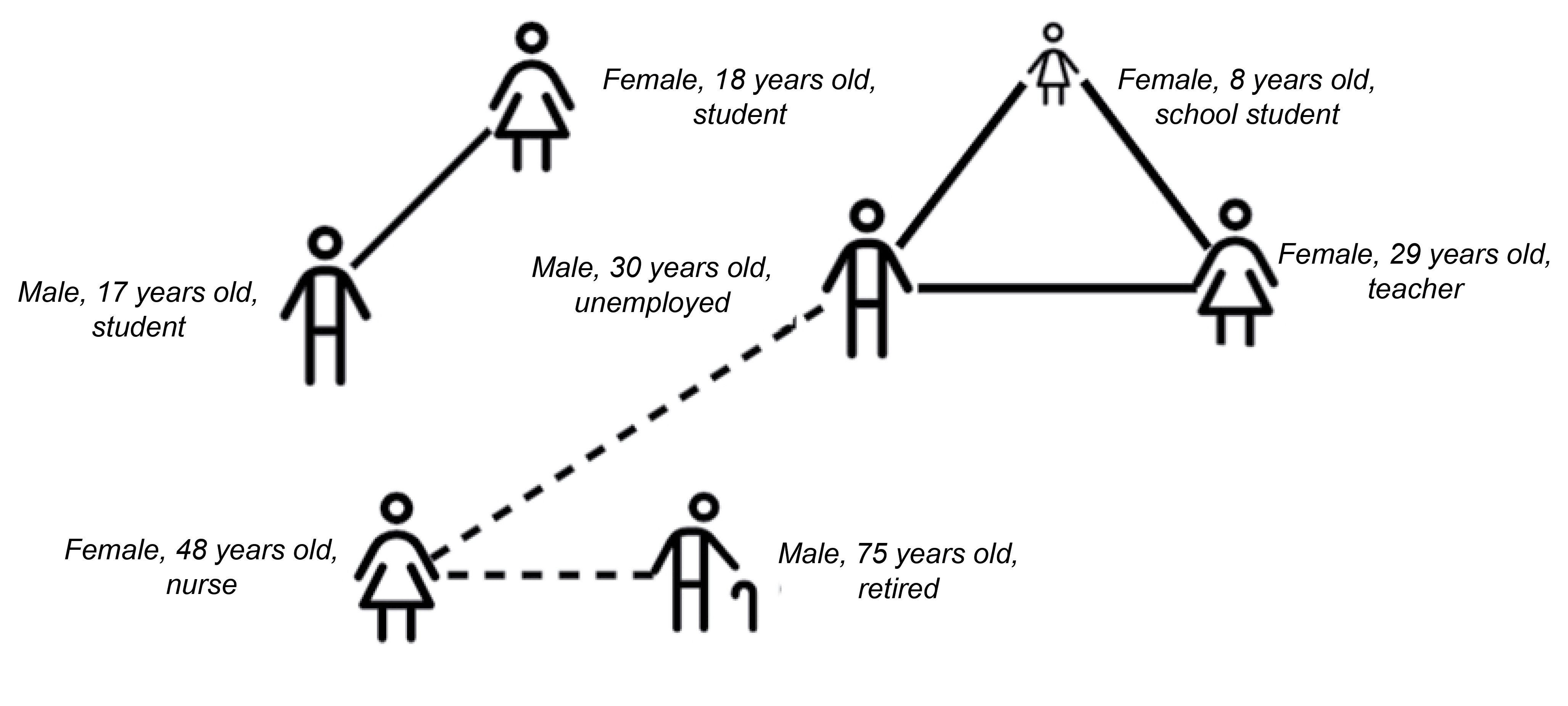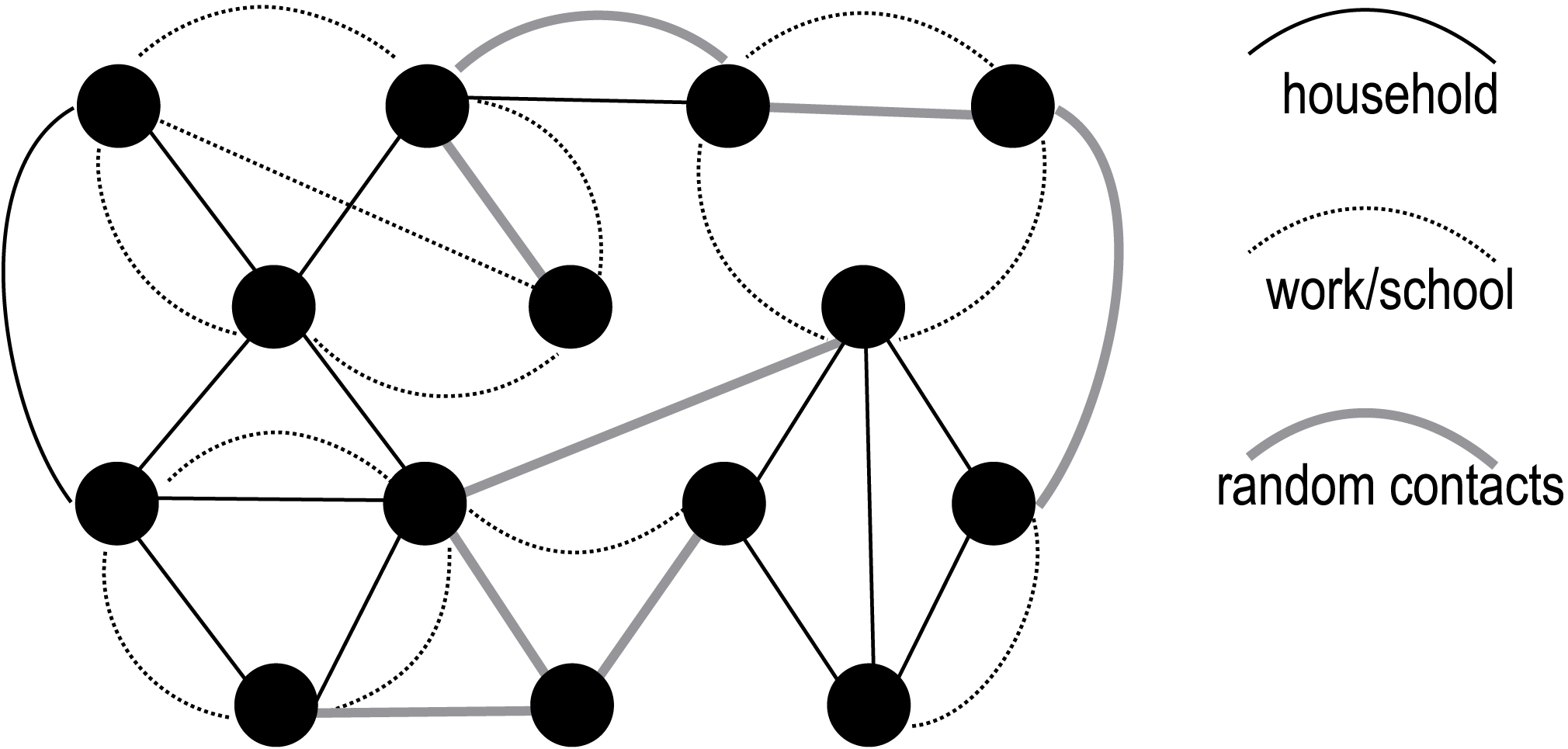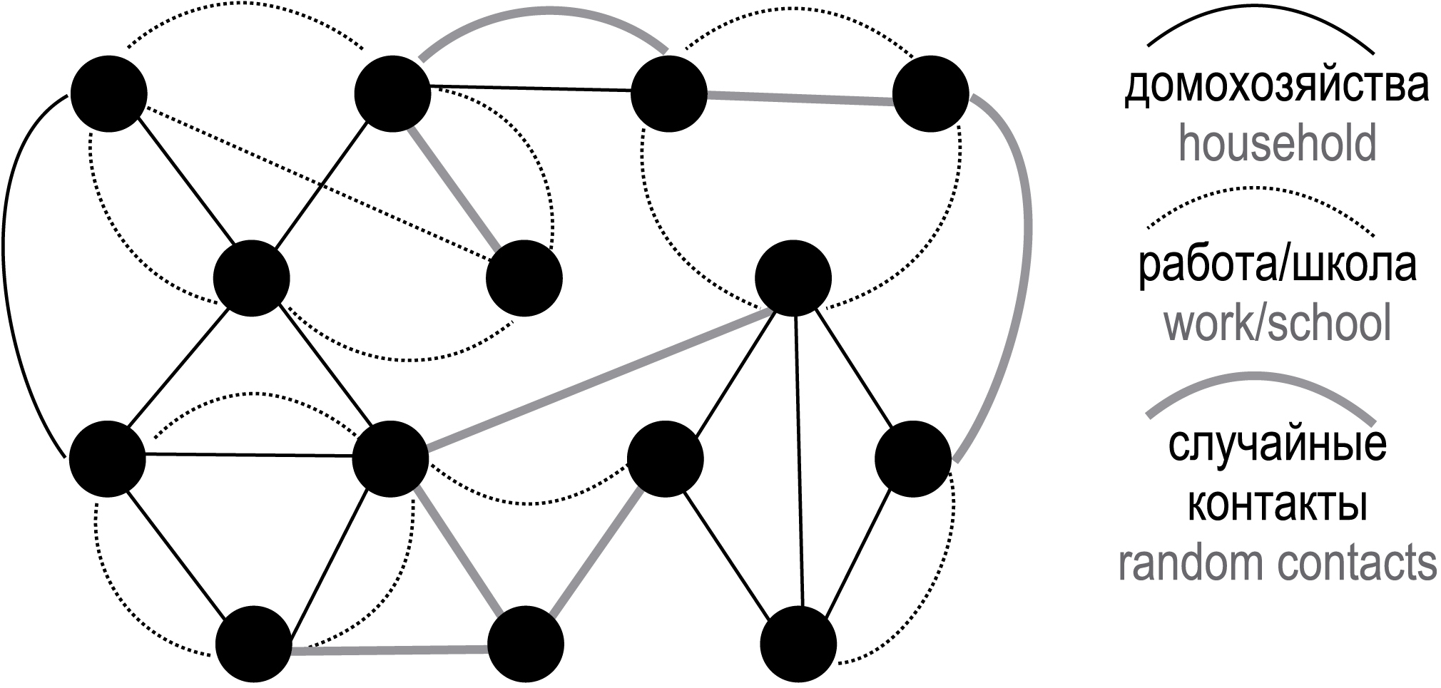 In the study conducted by N.N. Chung et al. presents a contact network consisting of a set of overlapping networks (households, dormitories, workplaces, dynamic crowd network, dynamic social gathering network) [21].