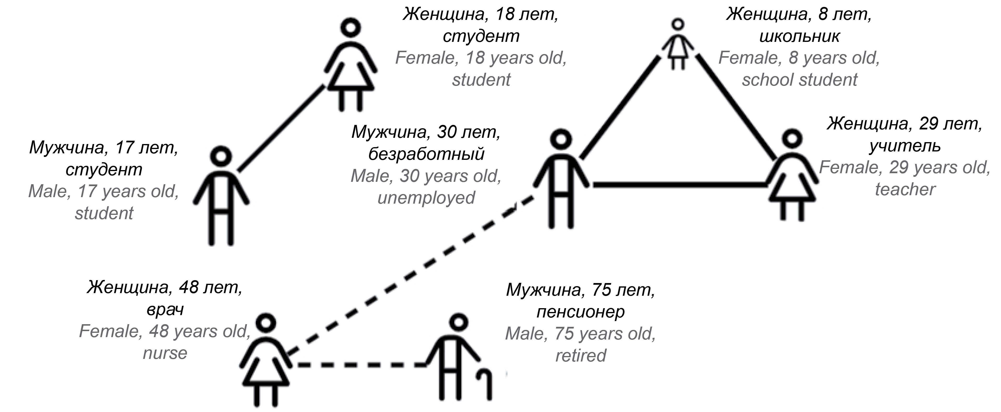 An artificial population without taking into account spatial localization and demographic properties of agents represents a graph — a network of contacting agents (Fig. 4). The stochasticity of such models is created by generating individual sets of connections at each node (agent) based on given probability distributions of the number of contacts.