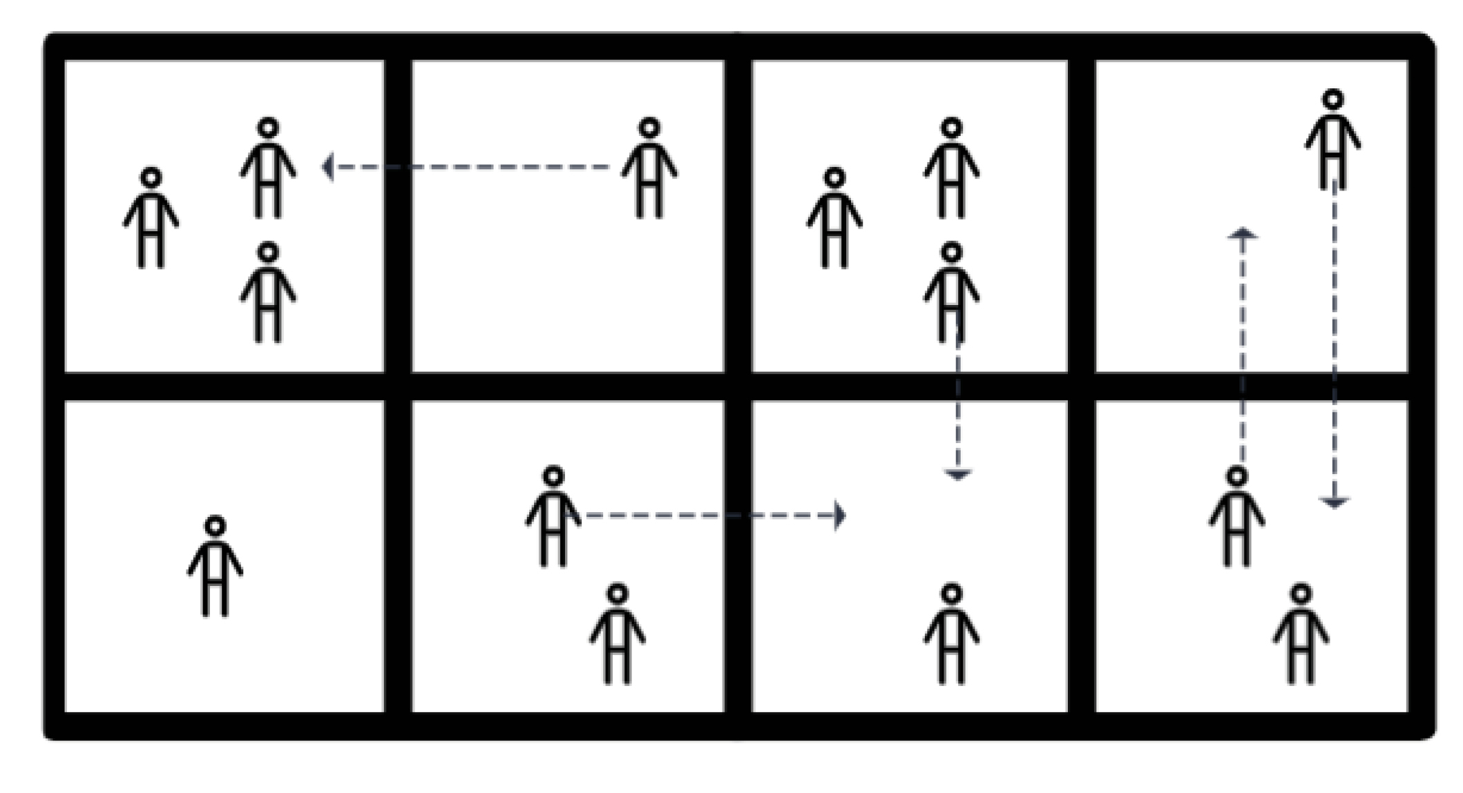Fig. 6. Representation of an artificial population accounting for the movement of identical agents. A contact is defined as a collision, approaching a critical distance, and/or agents entering the same cell.