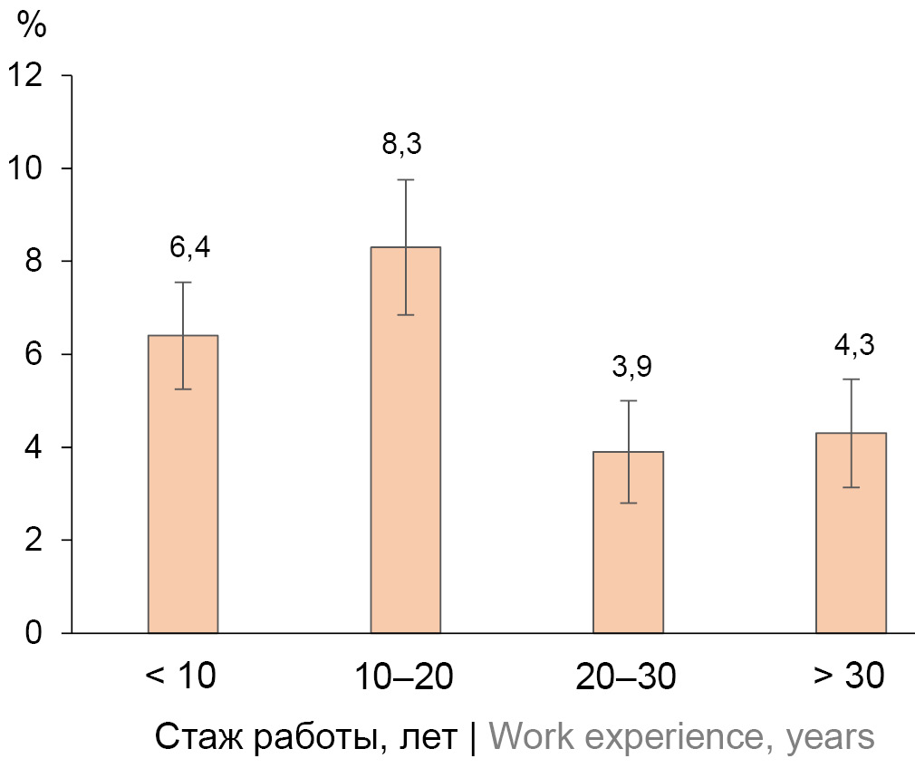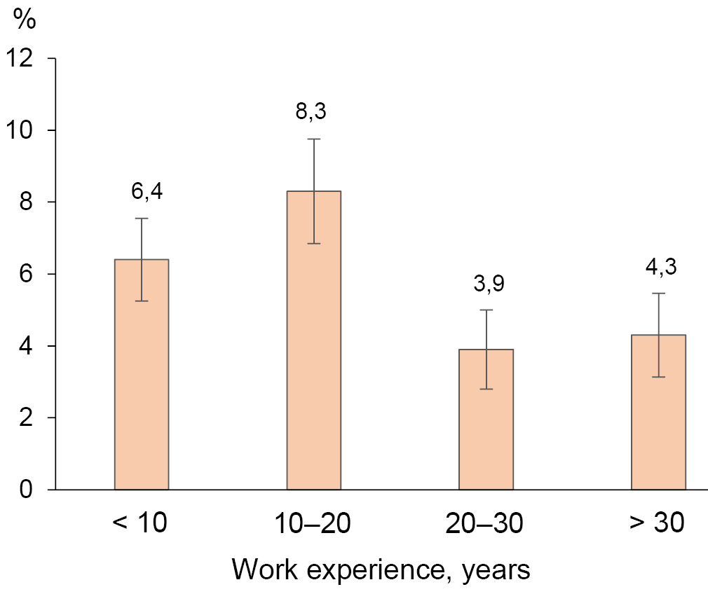 In the groups of hospital staff with less than 10 and up to 20 years of service in the HCO, the proportion of individuals without antibodies to VZV was higher than among staff with 20-30 and more than 30 years of service: 6.4 ± 1.1 and 8.3 ± 1.5% vs. 3.9 ± 1.1 and 4.3 ± 1.2%, respectively (p ≤ 0.05; Fig. 2).