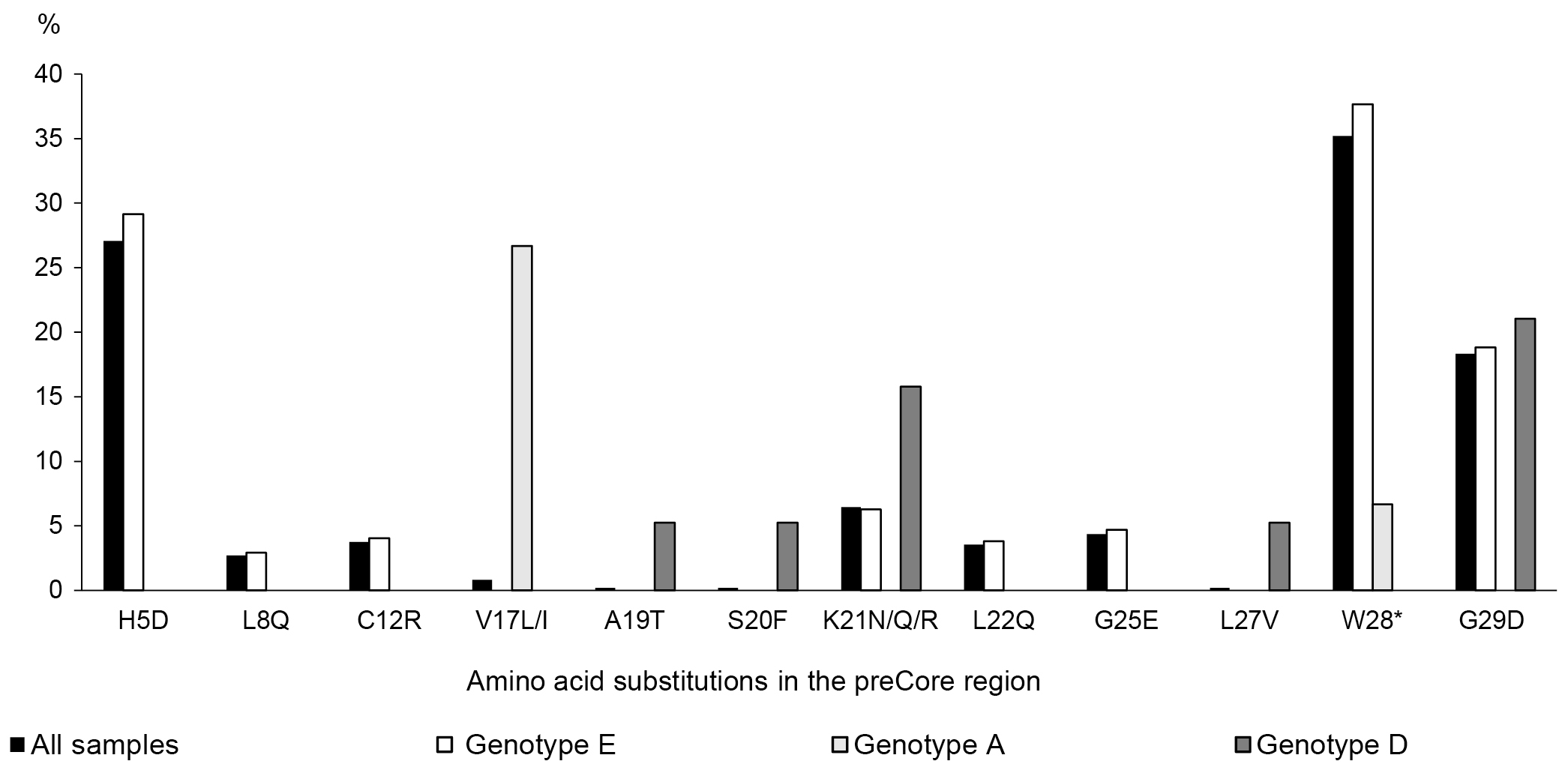 PreCore | H5D | 130 | 27,08 | 23,16–31,30 | E | Associated with severe liver disease in HBsAg-negative HBV genotype E. This mutation could partially explain the high prevalence of HCC in Africa 26] |