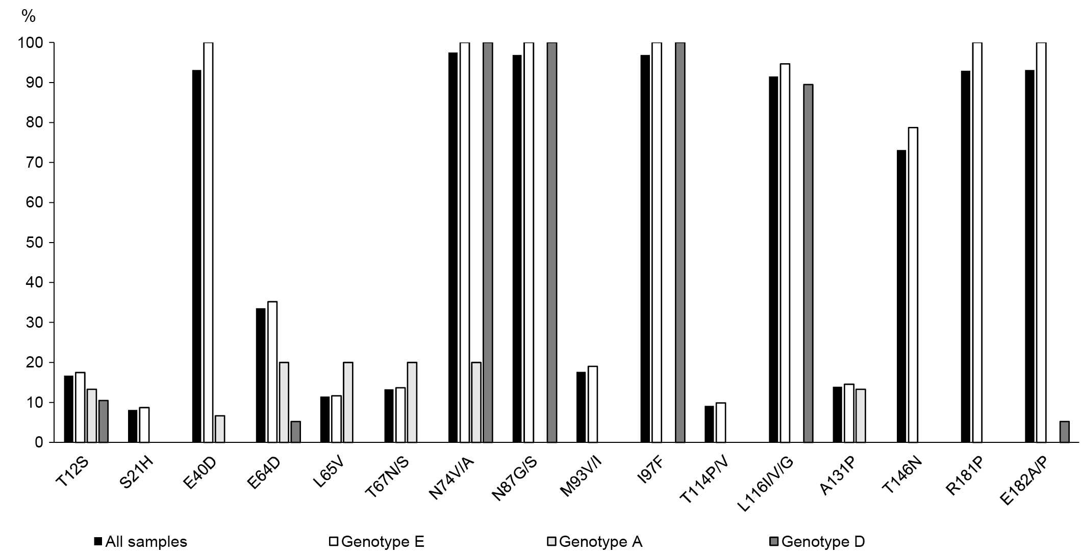 The distribution of Core region mutations among HBV genotypes E, A and D is also significantly different (p < 0.0001). For genotype E, substitutions S21H, V27I, R28K, Y38F, R39G, E46D, P79Q, M93V/I, G94A, F103L, I105T, T114P/V, F122C, W125T, R133T, S141P, L143T, T146N, V149I, R152G, R166P, R181P, Q184R/K/H, were identified, though not represented among HBV genotype A and D samples. Only mutations A11S, A34S, G63V, E77D/Q, L95I, T142I/S, D153G, R159G, S183P were detected among HBV genotype A, and mutations I3L, D4Y, F9I, V13G, L15F, S17L, L19F, D29G, Q57R, L162N, S178T were found among HBV genotype D samples. Evaluation of the distribution of polymorphic variants identified in at least 2 genotypic groups demonstrated significant (p < 0.0001) differences with higher frequency of occurrence and diversity of substitutions among HBV genotype E. Comparative inter-genotype analysis of the most common Core region amino acid substitutions occurrence in the examined group also showed differences (p < 0.0001).