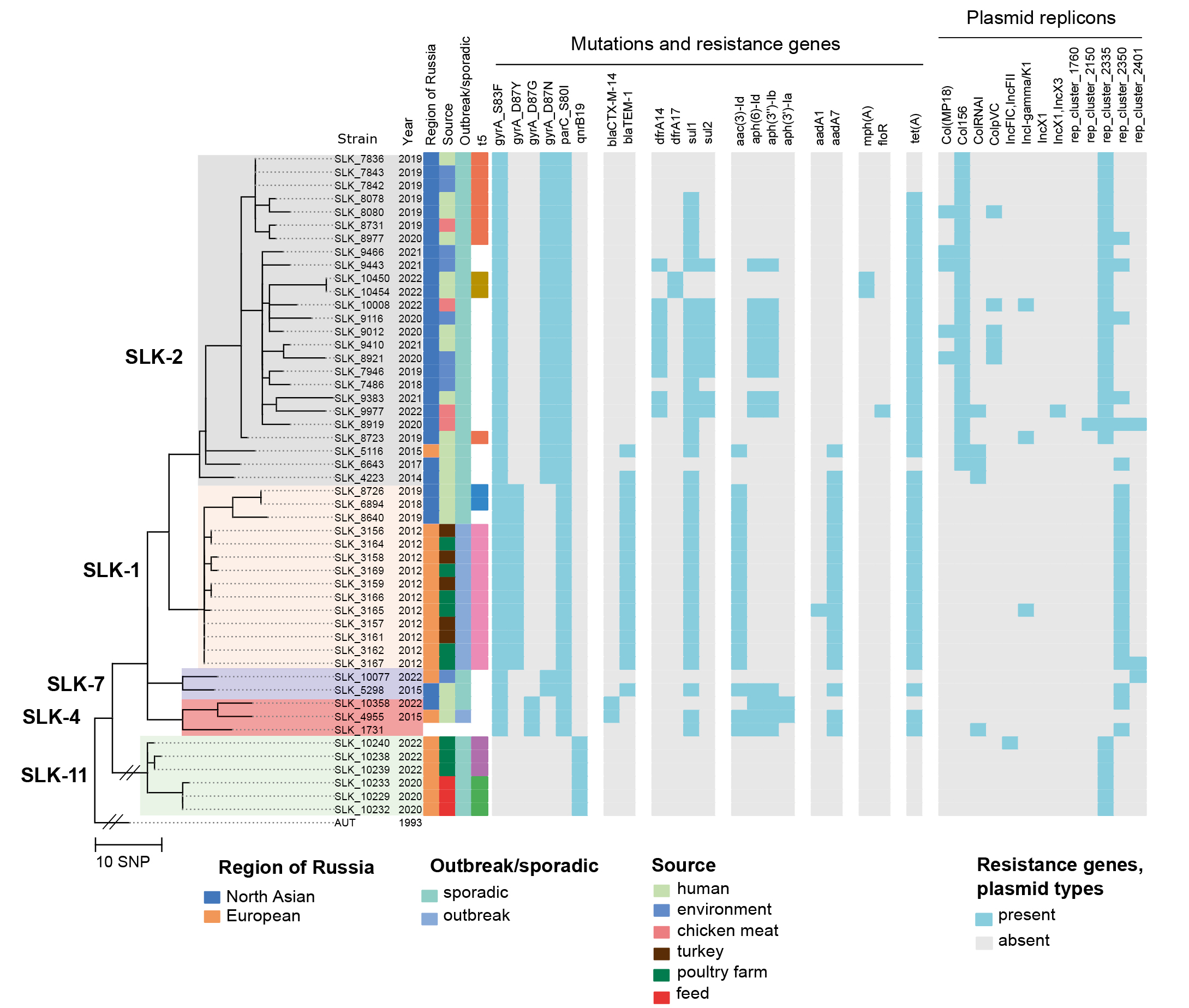 Two strains of the SLK-4 sublineage, SLK_10358 (Irkutsk, sporadic case in 2022) and SLK_4955 (a representative strain from a salmonellosis outbreak in Izhevsk in 2015), were representatives of the phylogenetic sublineage that has been associated with the S. Kentucky population established since 2005 in European countries [18]. The peculiarity of these ciprofloxacin-resistant S. Kentucky strains is the presence of the blaCTX-M-14 gene integrated into the chromosome, encoding ESBL [18]. This gene was also detected in Russian strains of SLK-4 sublineage. Cases of isolation of such strains may indicate single and independent cases of introduction of strains of S. Kentucky blaCTX-M-14 from the territory of the EU countries, but this assumption requires investigation of an expanded sample of strains.