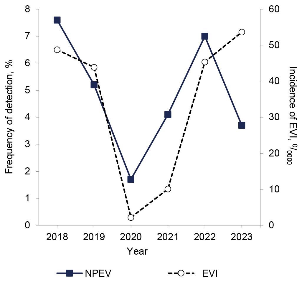 Fig. 1. Dynamics of the frequency of detection of NPEV (%) and incidence of EVI (per 100 thousand children under the age of 17 years) in the Nizhny Novgorod region in the period 2018–2023.