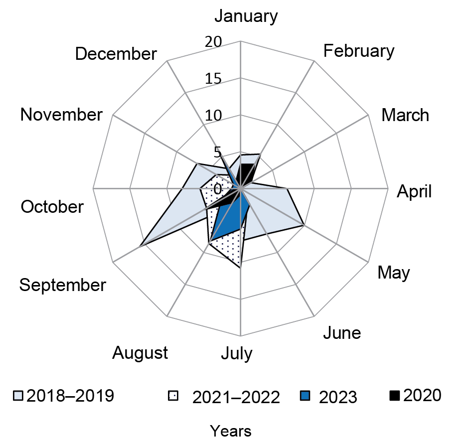 The monthly frequency of EV detection in different age groups of children with AII in 2018–2022 was analyzed. It was found that in 2018 and 2019 the dynamics of changes in the frequency of EV detection was homogeneous. A similar pattern was observed when comparing the seasons of 2021 and 2022, which made it possible to single out the combined seasons of 2018–2019 (pre-pandemic) and 2021–2022 (pandemic, cancellation of the lockdown) for comparison. The analysis showed that before the pandemic, EVs were detected in children with intestinal infection year-round, starting in April and ending in January–February of the following year. Peaks were recorded in May (10.0%; 22/221) and September (15.8%; 38/241). In 2020, EV detection peaked in September (5.7%; 7/123). During the 2021–2022 pandemic season, after phasing out restrictive measures, EVs in children with AII were detected from June through December, with a peak detection rate in July (10.8%; 34/315). In the 2023 season, EVs were more frequently detected in August (8.2%; 6/73) (Fig. 2).